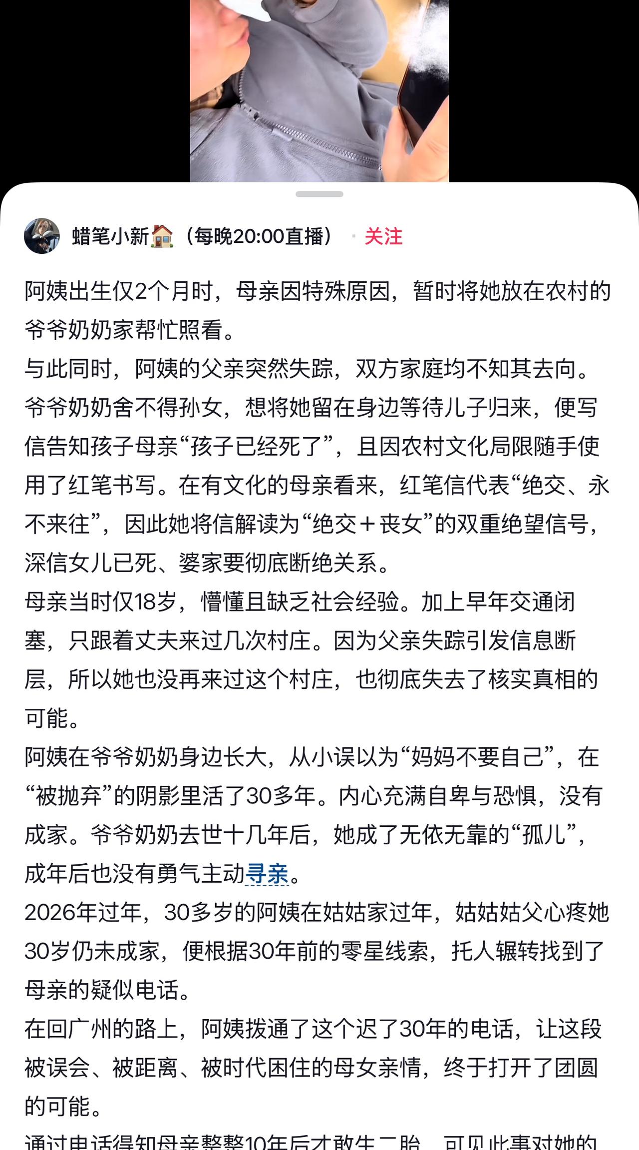 爷爷奶奶的棺材板要压不住了,隐瞒了三十年的弥天大谎被孙女戳破了,当年欺骗儿媳刚出生两个月的孙女早夭,亲母女三十年不知道对方还活在这个世上。 当小玉拨出那个姑姑姑父好不容易打听来的电话号码,听到亲生母亲确认的声音,小玉委屈的一句“我以为你不要我了”让现场的人破防,哭声一片。 小玉在两个月的时候,年轻的妈妈把她托付给爷爷奶奶照顾,紧接着孩子爸爸失踪,妈妈给孩子打钱买衣服买东西,爷爷奶奶为了想独占孙女给他万一回来的儿子养老,一封告知孩子已夭折的信,让她们母女再也没有来往。 小玉从小就在被父母抛弃的阴影里长大,爷爷奶奶直到去世也没说出真相。直到于心不忍的姑姑姑父 打听到孩子亲生母亲的联系方式,才真相大白,小玉妈妈当得知小玉还活着的时候又震惊又惊喜。 小玉妈妈带着后嫁生的女儿来和小玉相见,母女俩抱头痛哭。三十年缺爱的小玉把自己活成了一个“男人”,面对妈妈的拥抱手足无措,拘谨万分。 中性化的打扮是她的保护色,认识她的朋友都很喜欢她,知道她的外表之下是自卑柔软的心,现在的小玉已经是中层领导,很体恤下属。 希望小玉在妈妈相处的过程中,重新感受缺失的母爱,越来越好。