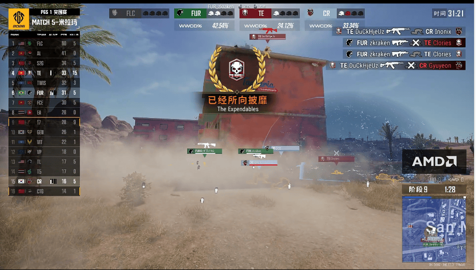 决赛圈,17两人开车转移,但TE道具覆盖17两人被淘汰,FUR撞击TE房区,双方互换多人。FLC无处可去先被淘汰,最终剩余TE与FUR1v1,TE高点优势获得胜利,成功吃下最后一鸡压线晋级。