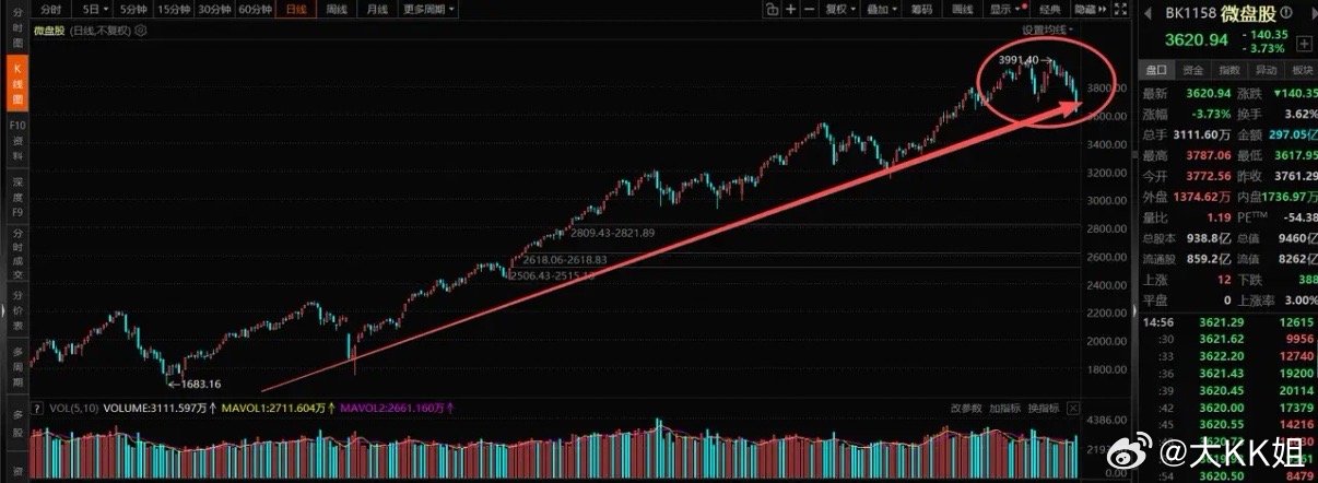 4、对于后市,重点留意这几点:一是指数虽日线破位,但本轮已回调超200多点,下跌空间基本打出来,指数层面已出现阶段性抄底机会;二是下周大概率超跌反弹,但反弹空间不会太大,4000点将迎来关键争夺,大概率先反弹再横盘震荡整理;三是反弹最怕量化逢高砸盘,光靠政策喊话效果有限,必须从源头管住恶意做空力量,才能真正稳住信心;四是警惕微盘股流动性风险。今天光模块冲高回落、算力补跌,微盘股更是直接破位大跌。微盘股指数经过一年多上涨后,现已跌破关键颈线支撑,后续反弹更适合逢高离场。叠加外围不稳、资金避险情绪升温、美联储降息预期降温,流动性收紧对微盘股压制明显。