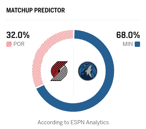 ESPN预测明日比赛:森林狼胜率68.0%,开拓者胜率32.0%