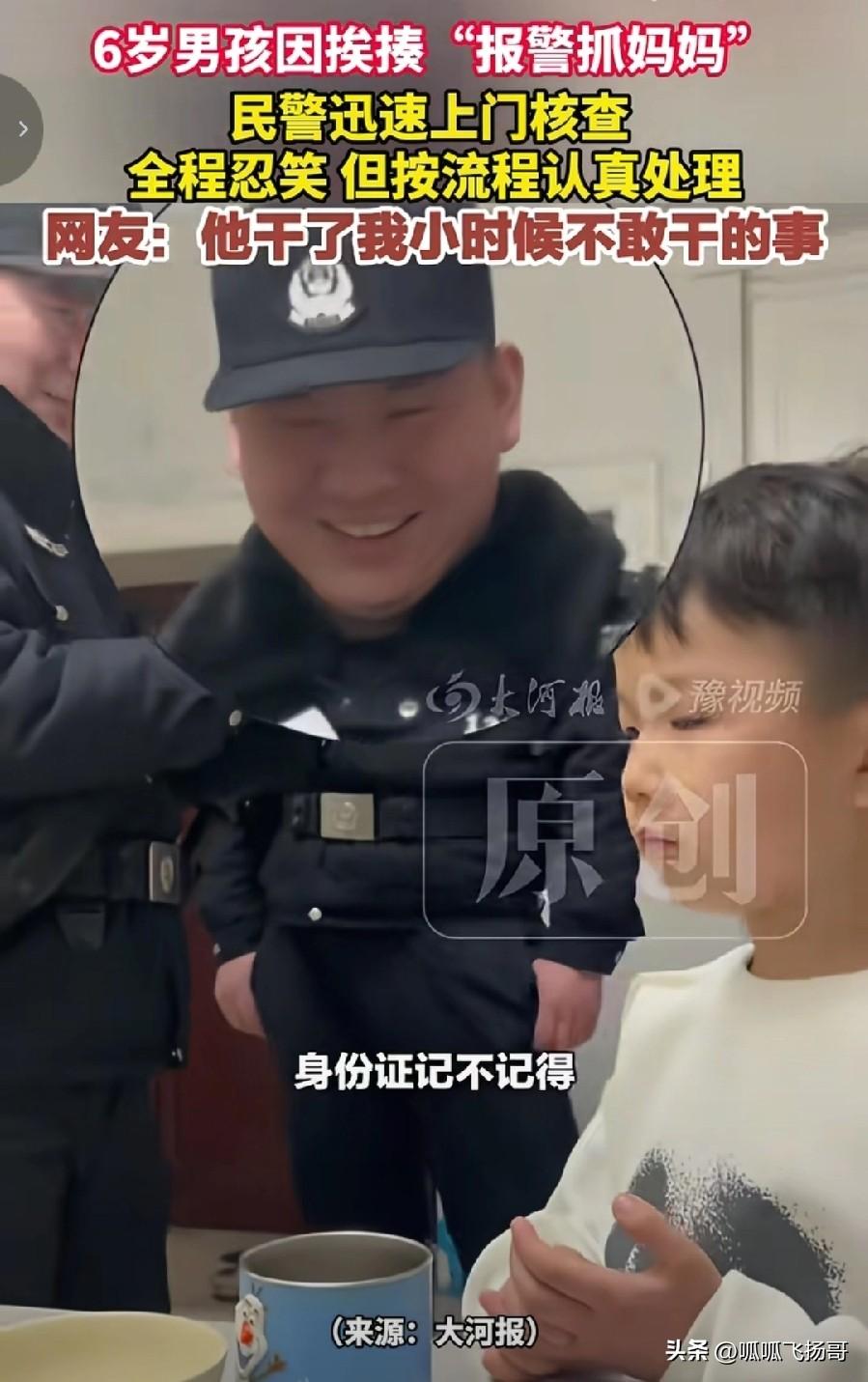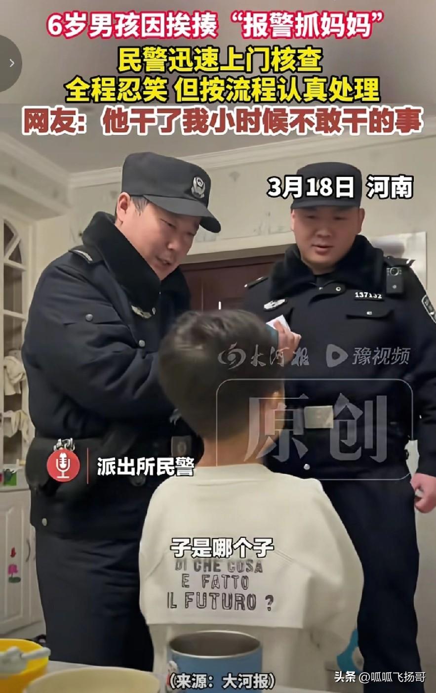 简直笑不活了,小朋友才6岁,调皮不听话被妈妈打了,于是打电话报警维权, 说妈妈太坏了,打了他,要警察叔叔来把妈妈抓走 。 妈妈偷偷在旁边看儿子有模有样的打电话报警又气又好笑。 没想到的是,儿子报警以后警察还真出警了, 还来了4个。 4个警察叔叔走进小朋友的家里忍住笑, 有模有样的问:“谁报的警”。 小朋友哭丧着脸说:“我报的”。 警察叔叔就开始按照办案程序有模有样做笔录, 全程憋住笑,问小朋友的名字,出生日期。 小朋友一一认真回答。 妈妈在旁边戏谑儿子:“你真有本事, 报警抓妈妈 ”。 儿子瞟一眼妈妈,“谁叫你打我?” 最搞笑的是警察问小朋友有无身份证, 小朋友回答说有,还叫妈妈去拿身份证。 笔录做完, 警察叔叔叫小朋友签上他的名字。 小朋友签字的姿态真的很认真,他妈妈说从来没有见他写的字有这么规整过 。 笔录做完了,妈妈就问警察叔叔,小孩子报案你们也要出警? 警察说小孩子报案我们也要重视 。小孩子报案不一定出了什么事情了, 小孩子这么小,他有这个意识很好。 妈妈就说这样出警你们就不怕浪费警力? 警察说我们不怕,这也算不上浪费警力 , 因为这个事情谁也不能料到它是真严重,还是有什么事 , 所以,必须得过来 。 警察叔叔说的太好了, 不能因为他是小孩子,我们就可以不当回事。 恰恰正因为他是小孩子 ,我们就要让他知道警察是值得信任的,是有求必应的。 我们看来好似一件小事,其实充分说明警察是有“警”必出,完全把老百姓的需求放在了首位,是负责任的体现 !