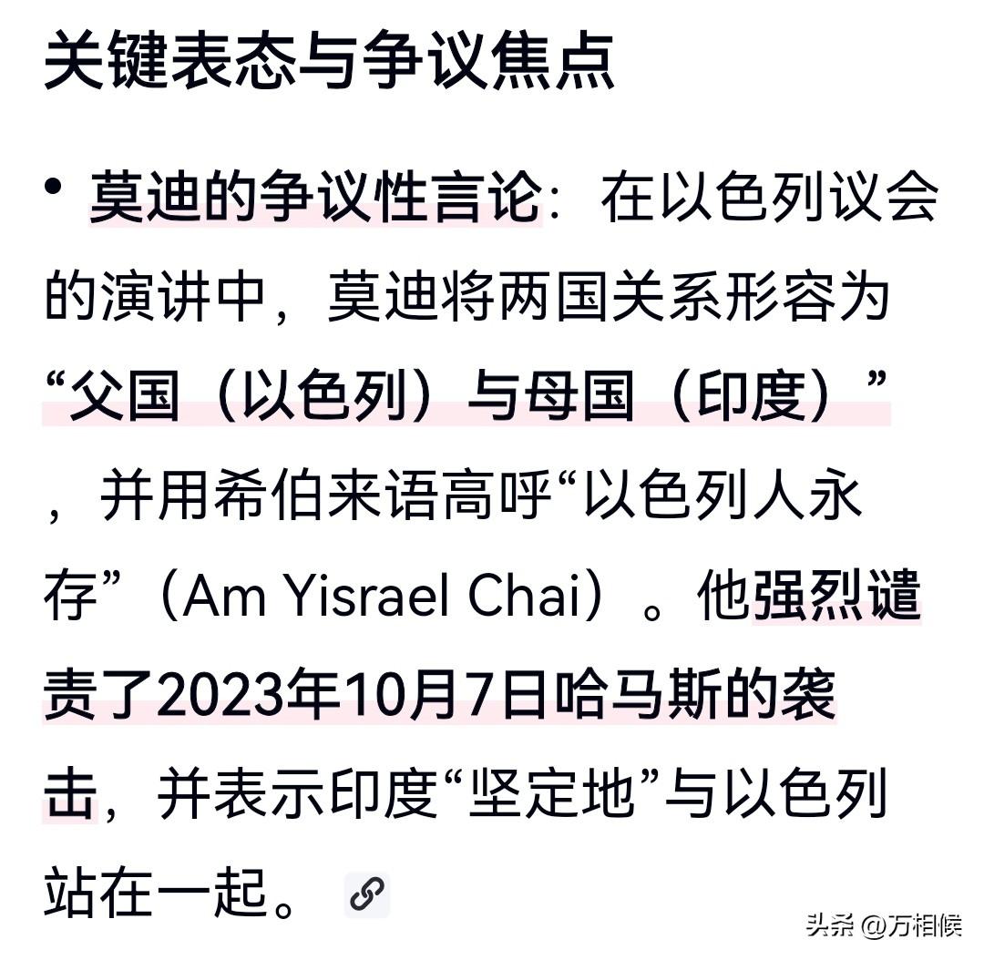印度总理莫迪,2026年2月25日-26日访问以色列,提出一个口号“以色列是父国,印度是母国”,并强烈谴责巴勒斯坦哈马斯袭击以色列。 莫迪表达的或许是愤怒,因为自己一直是西方世界的宠儿,因为大手笔购买装备,买什么都得让西方垂涎欲滴,更让西方国家感觉印度有钱,就算有万国装备还是感觉沾沾自喜。 2月28日,美以伊突发战事。而此时还有伊朗舰艇在与印度海军共同演习。3月4日在得知国家有战事并配合印度海军完成演习科目后回国途中。在印度洋斯里兰卡海岸线被一艘美国潜艇击沉。 伊朗艾瑞斯.迪纳号护卫舰有180名舰员,但被美国潜艇击沉后,造成104名舰员死亡,32人受伤,其余失踪。 一个父国一个母国还是头一次听说,但他们肯定为了共同的目的奋斗。只是印度的人口就快爆炸了,如何与一个人口快跑光的国家睡在一个被窝里。 后来知道,印度的高科技企业与以色列深度融合,印度在飞机航电系统,导弹导引头,航天工程项目,AI研发以及国安部门有热线沟通。 一对不正常男女的下一代基因也不可能是正常的,但他们能创造不一样的人,我们见识了