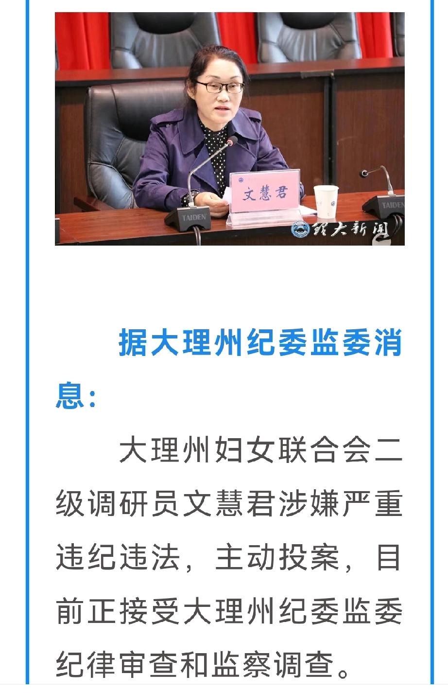 大理州原妇联主席文慧君主动投案,着实令人感慨。作为妇女联合会二级调研员,她本应起到表率作用,为妇女事业贡献力量,却涉嫌严重违纪违法。主动投案或许表明她已意识到自身错误,期望争取从轻处理。 在当下反腐倡廉的大环境中,此类案例并不鲜见。官员违纪违法不仅损害公众利益,还会破坏政府公信力。希望相关部门能对该事件展开彻查,给民众一个交代,也让更多官员以此为鉴,切勿在违法之路上越陷越深。