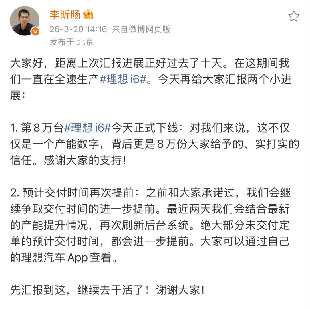 理想i6预计交付时间再次提前已经下线8万台了,而且产能起来了