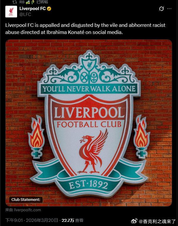 利物浦官方声明:利物浦足球俱乐部对科纳特在社交媒体上遭受卑鄙可憎的种族主义辱骂感