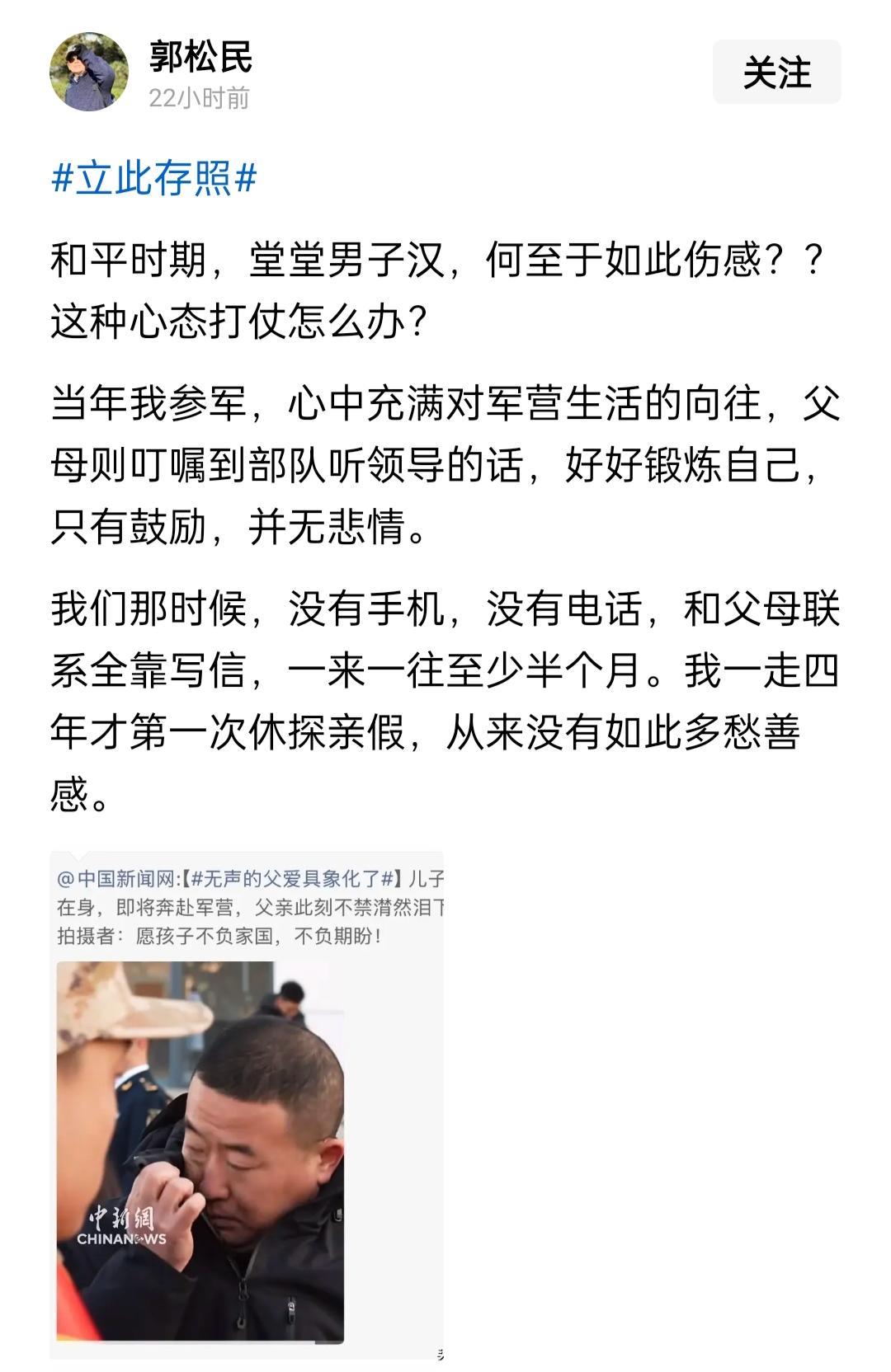 郭松民先生的这个评价令人心寒。 首先我们看这则新闻报道,说的是一位父亲落泪,因为儿子将要参军去了,然后拍摄者表示对参军人有期待。 郭松民不分青红皂白,说这么伤感,以后打仗怎么办? 那我请问郭先生,这是父亲参军,还是儿子参军? 整篇新闻报道都没有对儿子的表情有描述。 郭先生不会以为是图中的父亲参军吧? 然后,郭先生发挥了想象力,看到这位父亲这么伤感,认为这个儿子也是伤感的。这位儿子的情绪也可能是深受感动,立志报国。难道没有这个可能吗? 儿子去参军,父母们的情绪有不同之处是很正常的,有的父母开心,因为儿子去参军报国,为国家做贡献;有的父母伤感,那是因为以后几年都见不着面,心里多少有些难受。 大家的父母都不是一个模子出来的,为何都要向郭先生的父母一样? 参军报国,本是一件好事,郭先生不要拿情绪的尺子丈量,要尊重参军者家人的感情。