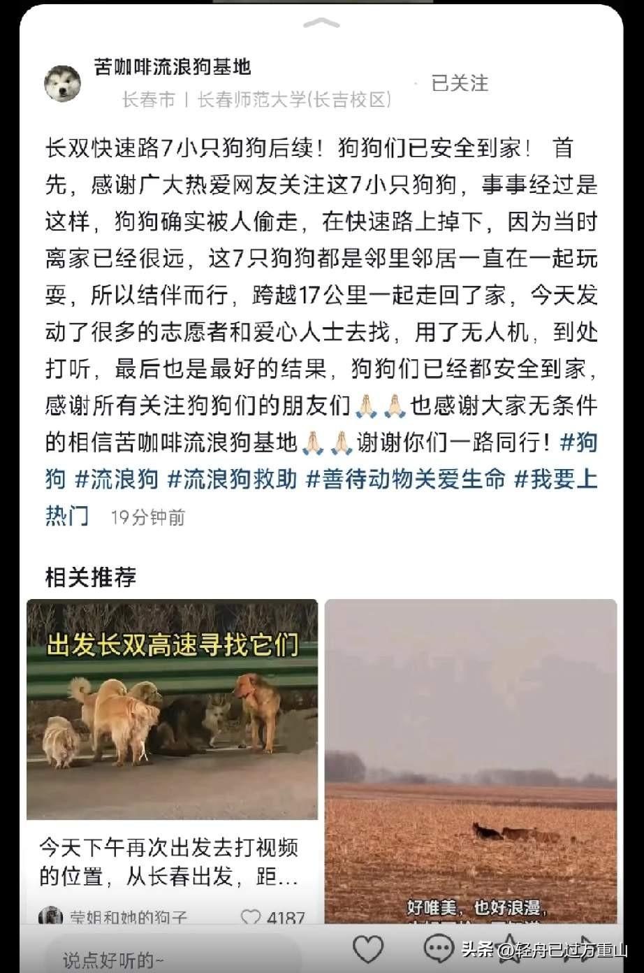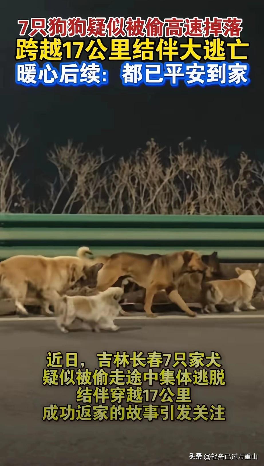万物皆有灵性!吉林这7只被狗贩子偷走的狗,真的让我震惊,几只狗有勇有谋,说干就干,逃狱奔走17公里路,一个都没有落下,路上相互照顾,最终成功回到主人身边,他们品种不同,大小不一,只因为来自同一个村子,是一起长大的狗腿子,于是不离不弃,几只狗竟然成功获得了自由。 大金毛个头最大,它遇事不慌,很有那种领导风范,一群狗子以它为中心,它前呼后应,在川流不息的马路上,用自己敦厚的身体挡着狗狗,时不时摇着尾巴,好像在安抚这群惊慌失措的狗朋友,告诉它们不要恐慌,一定能成功到达故乡。 德牧应该是在逃亡中受伤了,因为他很英勇,把铁笼子咬断了,让其他狗狗有逃出来的机会。但不幸的是它受伤了,其他狗狗应该是很感激它,对受伤的它不抛弃不放弃。 它们之所以他们会受到关注,是因为有网友拍下了在长双高速有一只德牧受伤🤕走不动坐那休息,而围绕在它周边的还有六只狗狗,其中有拉布拉多柯基还有两只小土狗,它们以圆形方阵把受伤德牧保卫起来,拍下来的网友是一个爱狗人士,他的视频引起大家的重视,想不到它们不是流浪狗,而是被人贩子偷走后逃亡的狗狗,就这样他们断断续续走了17公里。 边牧最辛苦了,虽然个头大,但是受伤的它实在太累了,估计路途遥远想过放弃吧!但是队友够义气,为了它一直走走停停,它累的时候一群狗子就停下来,没有因为它受伤就把它丢下,当它停下来时,短腿柯基一直围着它转,好像在安慰它要坚强,一定能成功。 他们的团结感动了网友,牵动着亿万网友的心,有网友拿着无人机跟拍他们的行程,他们在高速路和麦田里面死磕,就凭着对家乡的渴望和活下去的勇气,最后皆大欢喜,硬是成功回到了主人身边。