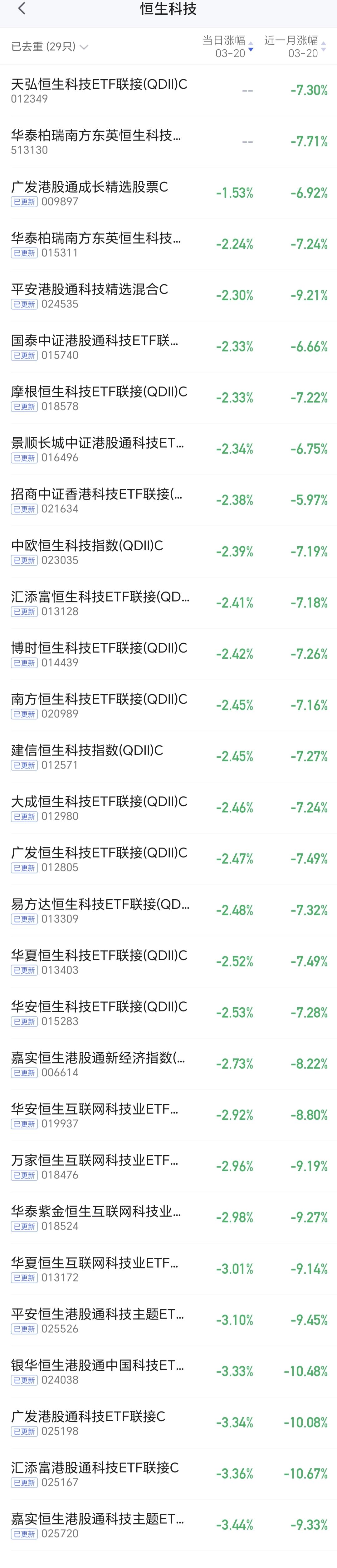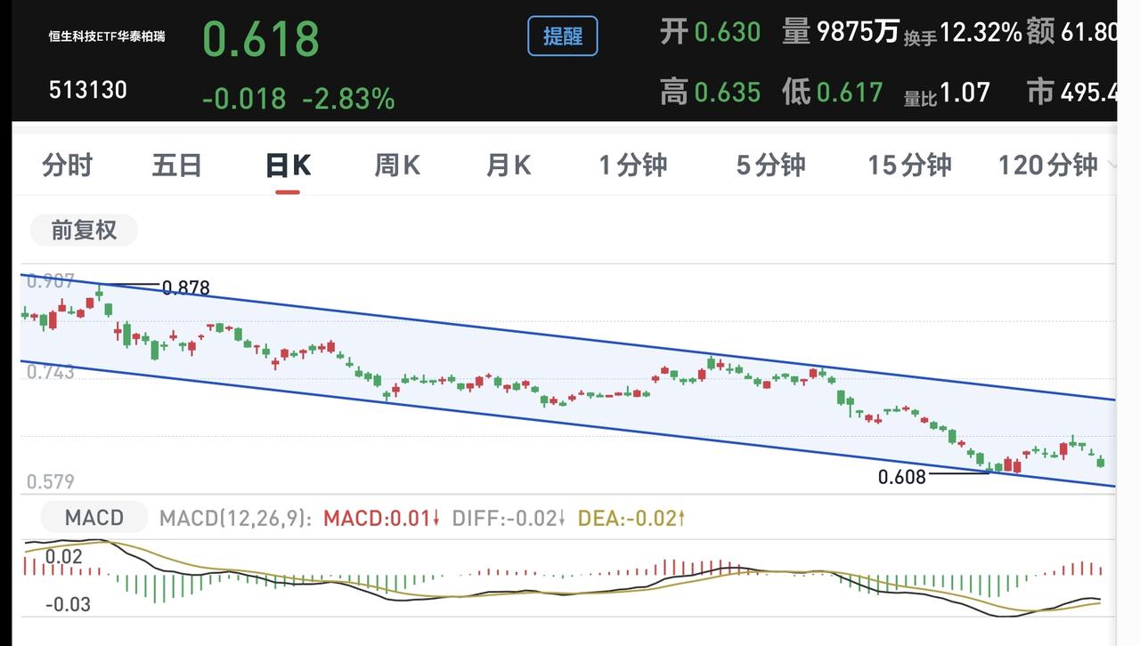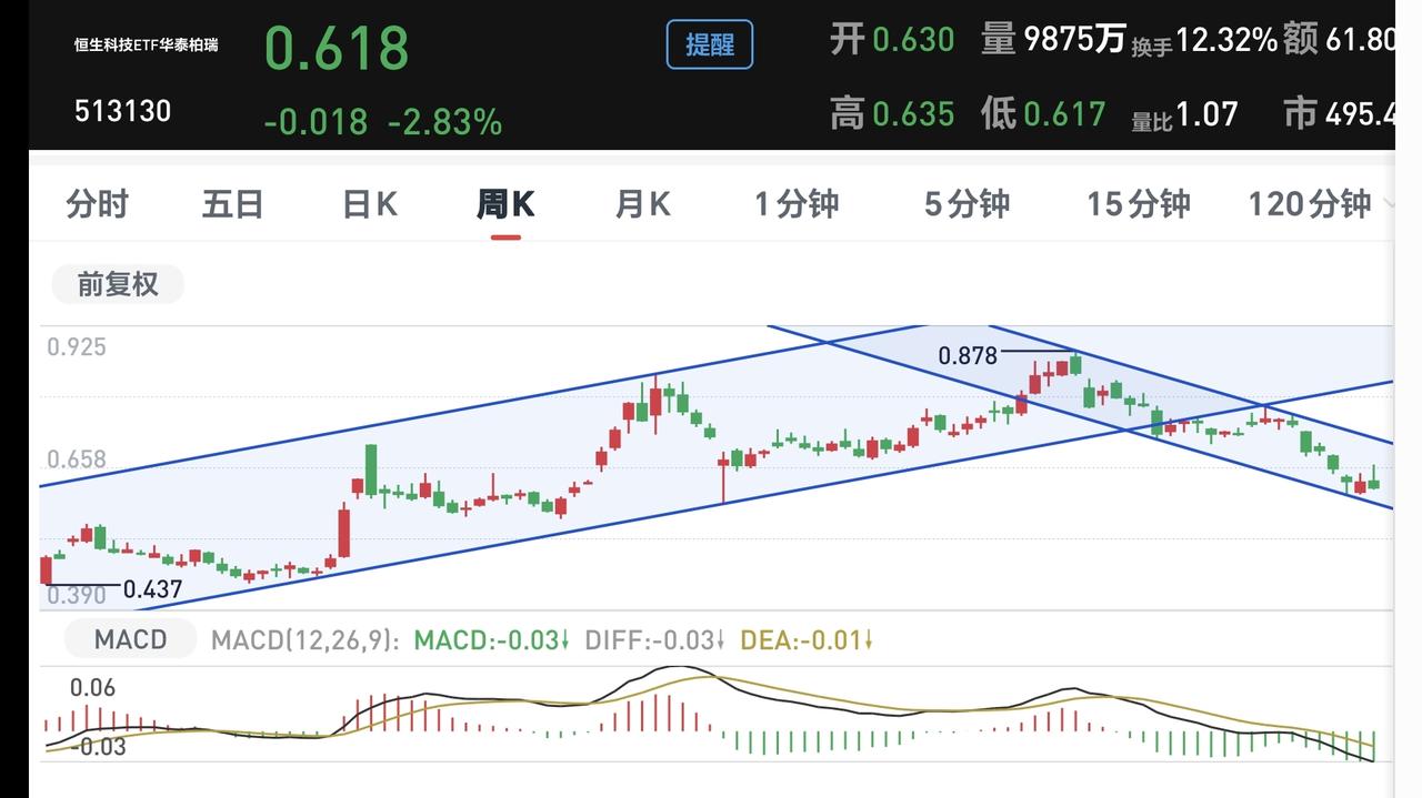 基金:恒生科技板块应该怎么办(周末讲解的板块1) 欧洲市场现在上涨中,法国上涨了0.27%,英国上涨了0.20%,德国上涨了0.19%,上涨幅度都不大。 香港市场今天是下跌,恒生指数下跌了0.88%,国企指数下跌了1.40%,恒生科技指数下跌了1.48%,下跌幅度都比较大。 恒生科技指数最近几个月来的表现都不是很好,许多人已经被深套其中,而且这个板块的散户人数比较多,持有人数在所有板块当中排名第7位。 恒生科技指数最近3个月以来下跌了11.22%,近半年以来下跌了23.16%,近一年以来下跌了19.94%,近三年以来上涨了16.88%,近一年以来,其实就是一个区域横盘震荡,现在只不过是震荡到了近一年以来的低位区域,这个板块的基金情况见下面的截图8,图中有各只基金近一个月以来的涨跌情况。 恒生科技板块日线级别处于下跌通道中,这个下跌通道比较标准,凡是上涨到这个下跌通道的上轨线就会震荡回落,凡是下跌到这个下跌通道的下轨线就会震荡反弹,现在的位置距离下跌通道的下轨线更近一些,一段时间以后,看看能不能找到这个下跌通道下轨线附近时候的进场机会,见下面的截图9。 恒生科技板块周线级别上涨趋势已经被破坏,现在形成了一个新的周线级别的短期下跌通道,这个周线级别短期下跌通道的时间段,与日线级别下跌通道的时间段是重合的,所以,恒生科技板块只要观察日级别下跌通道的情况就可以了,见下面的截图10。 恒生科技板块是值得重视的,这个板块里面的股票大部分都是优质公司,只是他们受世界经济的影响更大一些,也就是受外围市场的走势影响更大一些,当外围局势平息之后,这个板块不排除有一个很好的走势,而且,这个板块现在的位置处于相对低位区域。 我对每个板块的分享,都是纯技术面的讲解,没有考虑外围消息面的影响,每个人根据自己的情况,做出适合自己的操作策略,我的分享只代表我个人的看法,不能作为你操作的依据,据此操作后果自负。