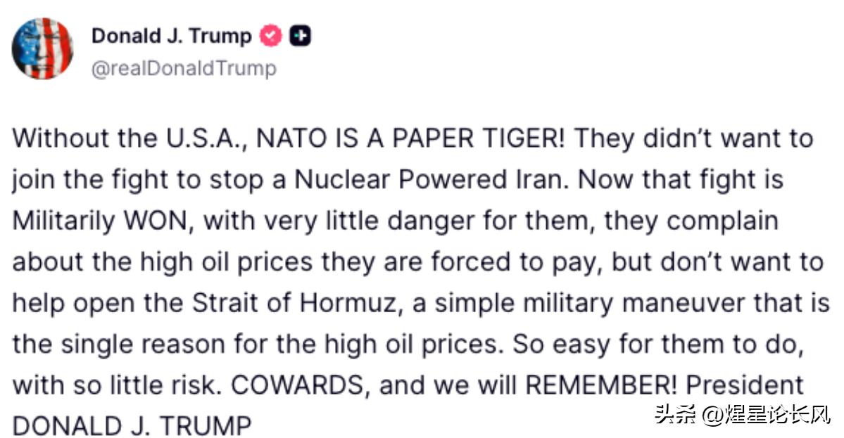 特朗普表示,没有美国,北约就是纸老虎!将铭记采取行动与袖手旁观的国家! 这是着急了?3月20晚间看点, 伊朗与美国、以色列的战争已经进入到了第21天,以下是特朗普及美国媒体对伊朗的相关态度与动作! 1、据特朗普发文表示, 没有美国,北约就是纸老虎!他们当初不愿加入阻止伊朗发展核武器的战斗。 现在这场战斗已经取得了军事胜利,对他们来说几乎没有任何危险,他们却抱怨被迫承担高油价,却不愿帮忙打通霍尔木兹海峡——这明明只是一个简单的军事行动,却正是油价高企的罪魁祸首。 对他们来说,这轻而易举,风险却微乎其微。懦夫!我们会记住你们的! 2、据美国福克斯新闻信息显示,“我们将铭记!” 特朗普总统就伊朗问题向全世界发出警告,无论那些采取行动的国家还是那些袖手旁观的国家,并称那些拒绝帮助开放霍尔木兹海峡的国家是“懦夫”。 3、据美国福克斯新闻信息显示特朗普称北约是“纸老虎”,抨击盟友在伊朗和油价问题上的立场 4、由于地区冲突升级,北约已暂时中止其在伊拉克的任务,并撤出了约 600 名人员。 综合来看(个人观点),从特朗普的发言来看,就知道特朗普是真的着急了,不是说伊朗的海军、空军已经没有了,导弹已经摧毁了90%。怎么还需要盟友呢?现在的特朗普真是尴尬到了极点。想结束太丢人,不结束又消耗不起。 对于以上事件你有什么看法,欢迎评论区留言探讨,你怎么看呢?关注我,获取更多国际精彩资讯!