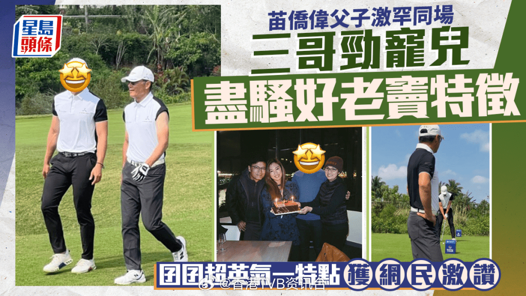 苗侨伟囝囝遗传父母优良基因高尔夫球赛当天,三哥英气不减当年,挥杆姿势潇洒有力,而现年32岁的儿子苗俊,更是完美继承了父母的优良基因,身形高大挺拔,五官俊朗,阳光帅气的模样丝毫不输明星父亲。两人穿着黑白相间的“父子装”,并肩而行,时而驾着高尔夫球车穿梭球场,吸引了不少粉丝举机拍照。