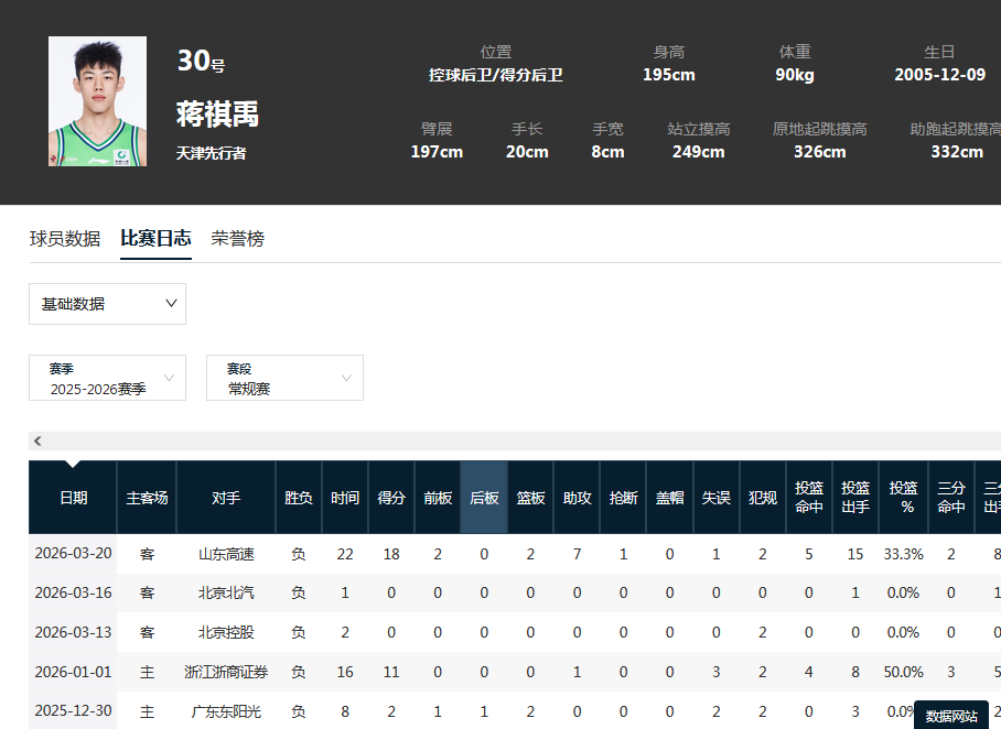 另一名表现出色的小将是天津队20岁的蒋祺禹,他替补出场22分钟15中5得到18分2篮板7助攻,其数据堪比首发的林庭谦,出手数也追平詹姆斯和林庭谦这样的核心球员,论出场时间效率,他比林庭谦的效率还高。蒋祺禹本赛季只打了5场比赛,这也是他的首个CBA赛季,场均9.8分钟时间得到6.2分1.6助攻,场均也有一记三分进账。得分和助攻也创造个人新高。虽然这一场天津队遗憾失利,但是球队收获一名即战力也是不错。