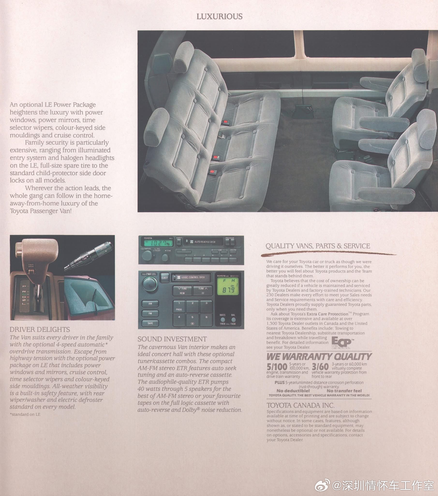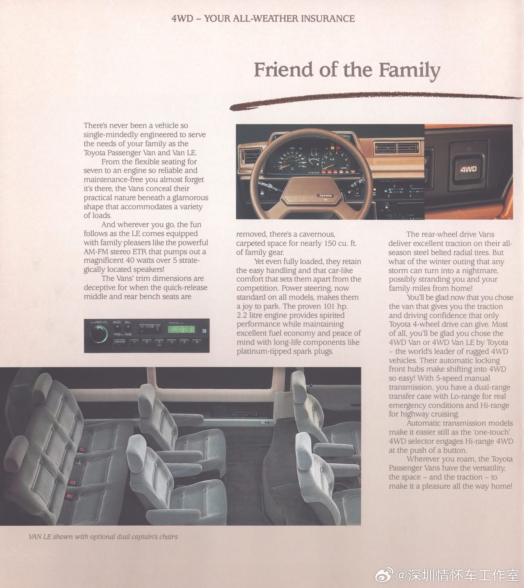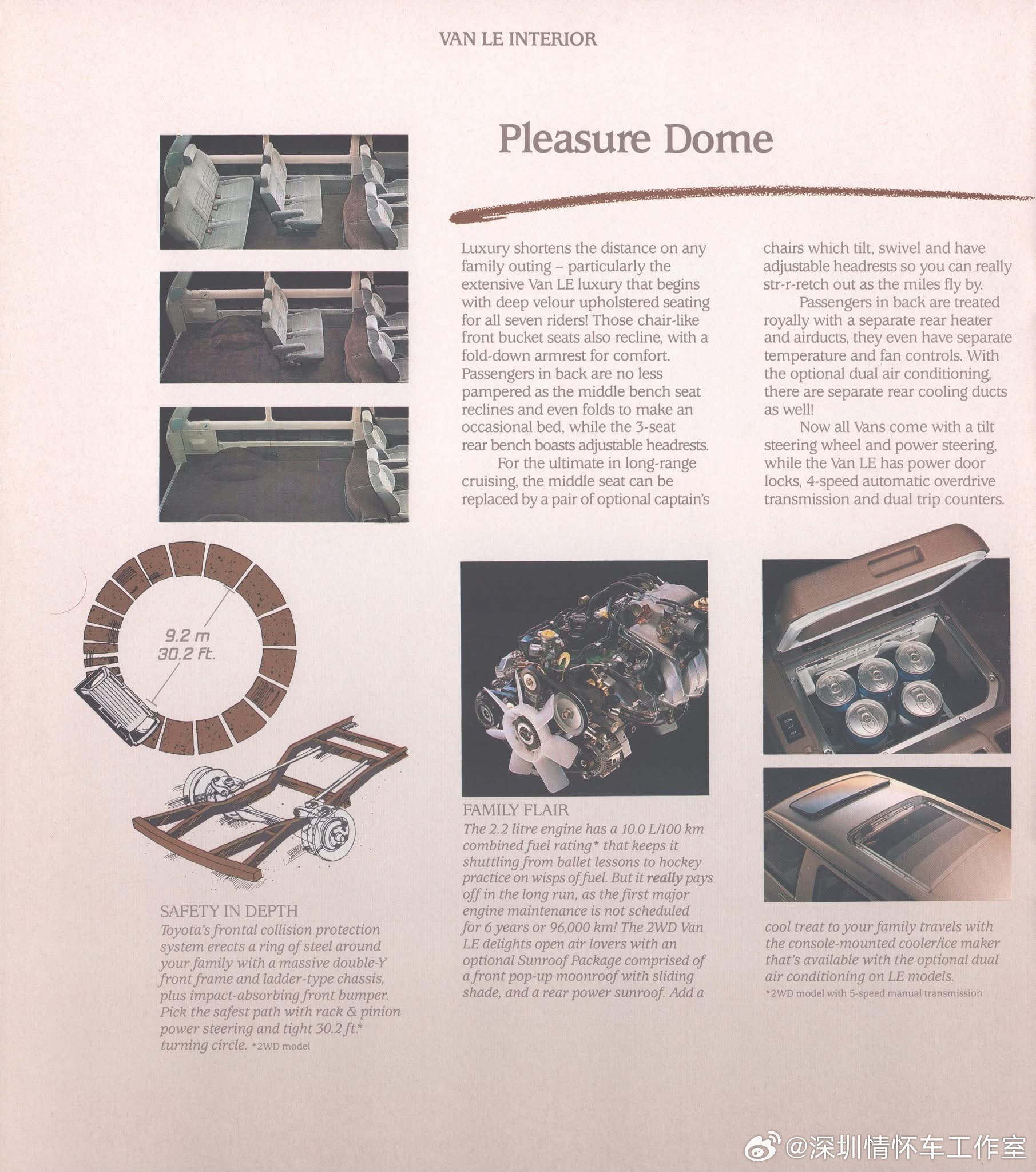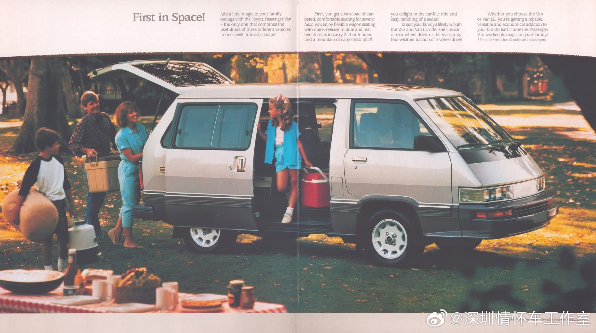 1989款丰田Van是在北美市场的官方命名,属于3门紧凑型MPV/厢式车,生产周期1984-1989,1989是该代的收官年份;本土叫MasterAce,欧洲叫Space Cruiser,澳洲叫Tarago;我们叫小霸王,后被Previa(普瑞维亚)接替。);小霸王属紧凑型中置引擎MPV/厢式车,3门,区别于海狮的方正,采用倾斜前脸;前置中置引擎,后驱/1987年后可选四驱。小霸王是丰田早期进军全球家用MPV市场的主力,短轴+四驱版本在欧洲/北美有不少户外与小型商用用户;其中置引擎MPV的尝试,为后来Previa、Sienna积累了技术与用户基础;如今在情怀车市场,四驱版MasterAce/Toyota Van的保值率高于普通后驱版。该车1980年代末–1990年代初以原装进口为主,通过外贸渠道、平行进口、港澳带入进入国内,以2.0L 3Y汽油、5速手动为主,少量柴油2C。当时的小霸王比海狮更小巧、更偏乘用,比轿车空间大、能拉人拉货,在90年代国内中产/商务标配。