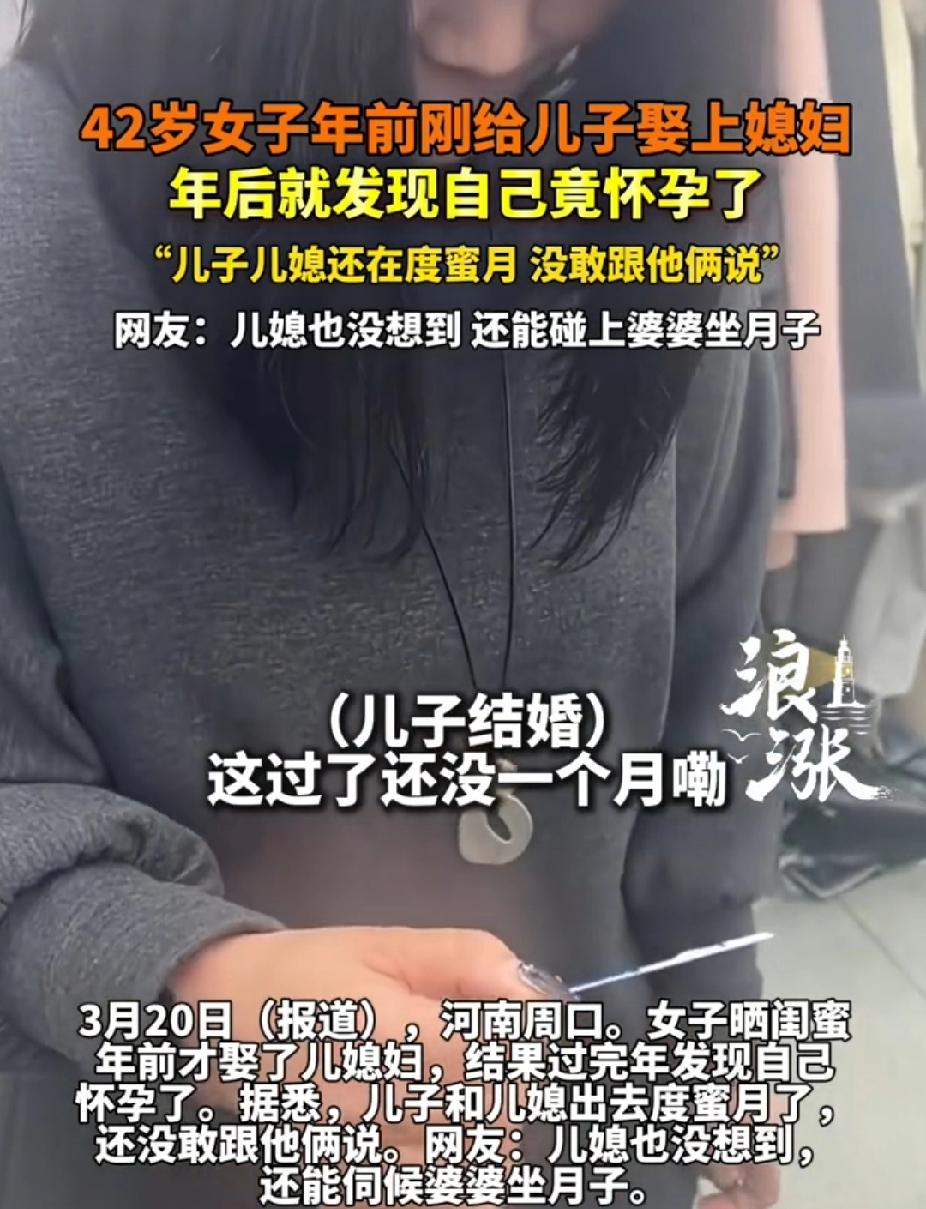 “太意外了!”河南周口,42岁女子在年前刚给儿子娶上媳妇。没想到,年后自己竟然怀孕了。由于儿子儿媳出去度蜜月了,她没敢跟他俩说这件事情。对此网友表示: 儿媳也没想到,还能碰上婆婆坐月子。 女子就是希望儿子能早点结婚,这样小两口有了孩子,她也好帮忙带。然而年前,她儿子结婚了,当时她高兴忙前忙后。 而她儿子结婚后,年后,小两口就出去度蜜月了。但她在家里,却开始老是犯恶心。 于是她就去医院检查,结果没想到,她怀孕,这让她自己都感到意外,毕竟自己都这年龄了。按说这也是喜事,可她却发愁了,因为她觉得自己当婆婆几天时间,还想着帮儿子儿媳带孙子,但现在这情况咋弄,她还没敢告诉儿子儿媳他们这事。 这也主要她不知道该怎么跟他们说,而这孩子是要还是不要,所以她就求助网友们。 这一幕也是引发网友们热议。 有网友说: 咋弄? 简单,先让儿媳妇伺候婆婆坐月子,然后礼尚往来,婆婆再伺候儿媳妇坐月子! 也有网友说: 双喜临门!如果儿媳妇这时候也怀了的话,那就是喜上加喜加喜了。 还有网友说: 这下要是儿媳妇也怀孕了,丈母娘过来要照顾两个了。 女子原本盼着早点抱孙子,好帮儿子儿媳分担带孩子的压力,结果自己先成了高龄孕妇。 如果这时,儿媳也怀孕,那么婆媳同处生育阶段,那么到时谁照顾谁呢,这样一来,原本的家庭节奏和角色分工,可能会被打乱。 所以,女子犹豫要不要这个孩子,以及没敢把这件事情告诉儿子儿媳他们,毕竟儿子儿媳新婚燕尔,正是蜜里调油的阶段。 如果这时候抛出这样一个重磅消息,确实需要勇气。但换个角度看,这事儿本就不是她的“错”,更没必要自己一个人扛着。 而怎么开口说这件事,主要还是一家人的沟通方式。 这事要是藏着掖着,那么只会让误会越积越深,尽早坦诚沟通,反而可能换来理解和支持。 所以,生活不是按剧本走,这意外来的突然,但是一家人之间,坦诚总比隐瞒走得长远。 希望女子能做出不后悔的选择,也相信真正的一家人,能接住这份意外带来的喜与愁。 (来源: 浪涨新闻)
