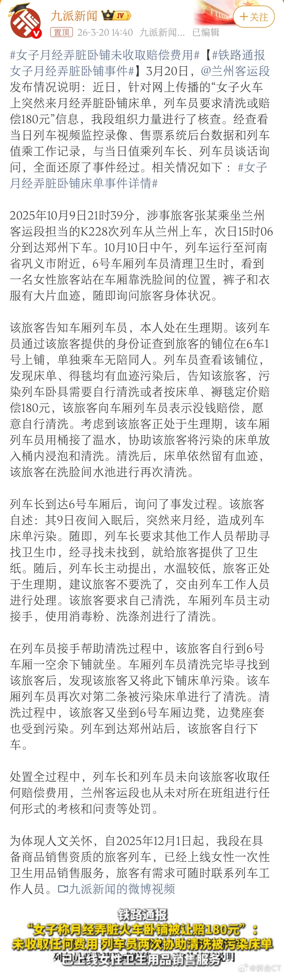 铁路通报女子月经弄脏卧铺事件