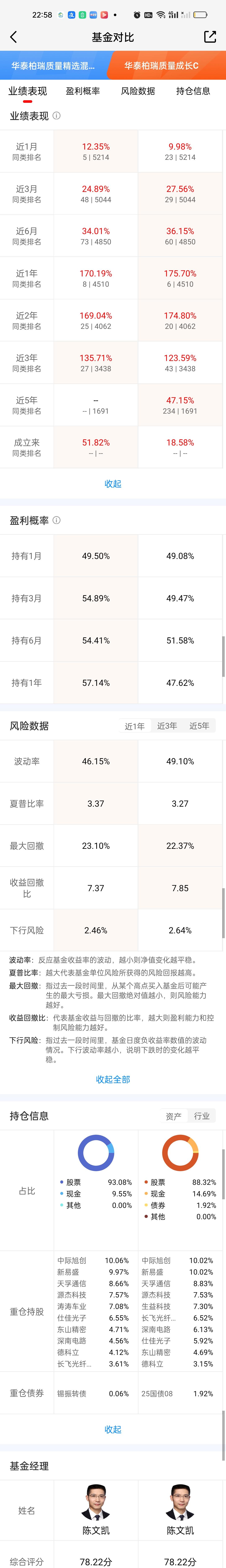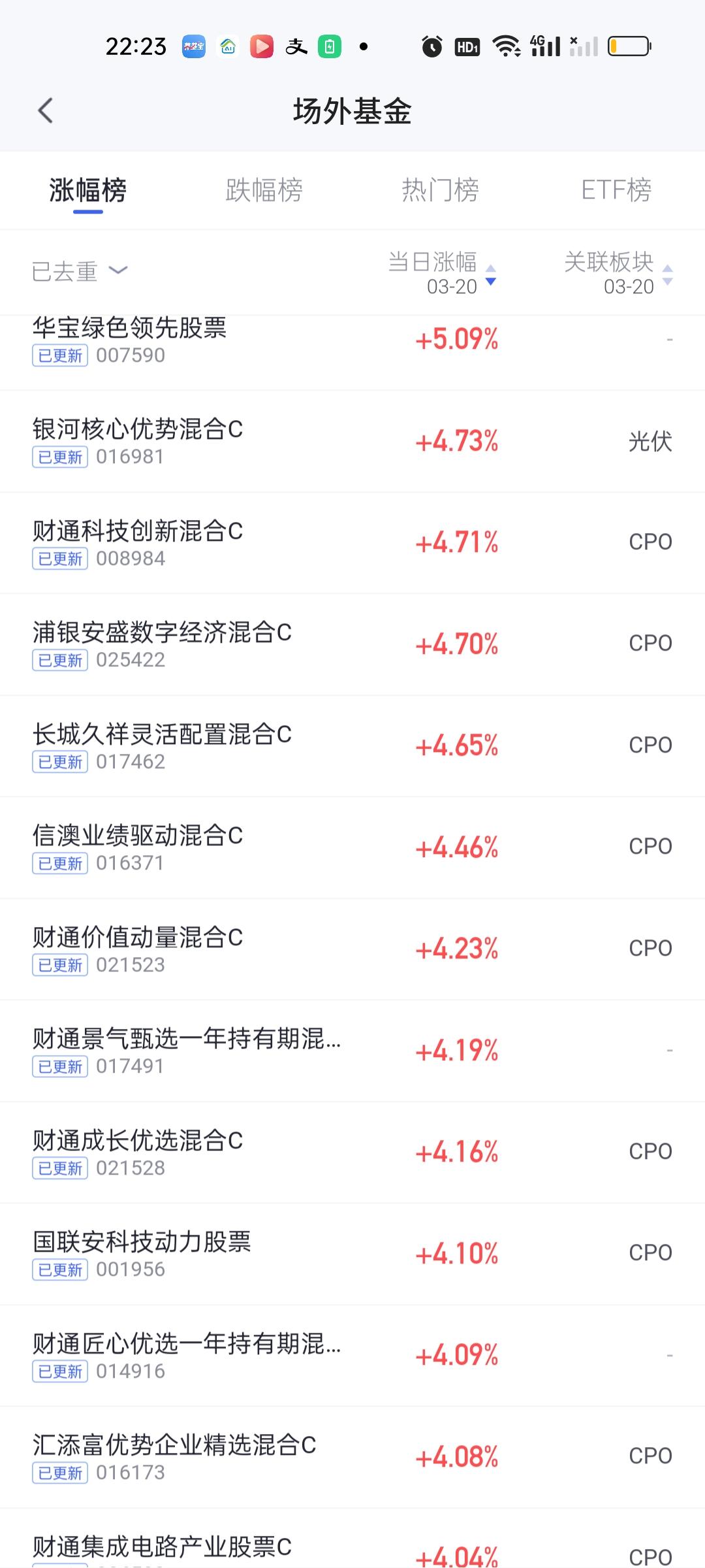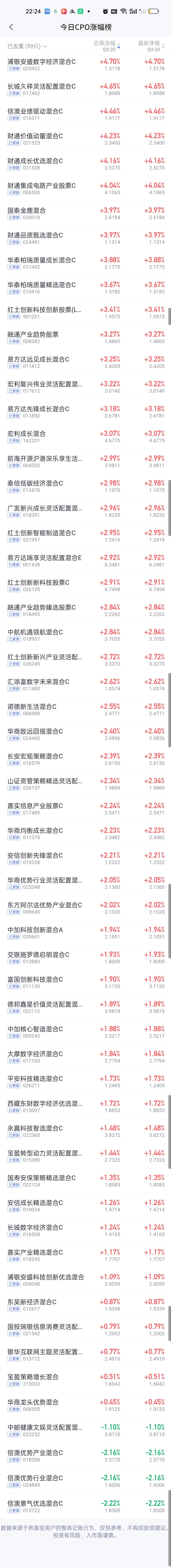 今天CPO板块的涨幅位居前列。当然这个板块的基金今天也涨得非常好。浦银安盛数字经济算是CPO板块的新秀,今天开出4.70%,是整个CPO板块涨幅最大的基金。 这只基金去年9月11日才成立,到今天刚过半年时间,目前最新规模3.17亿,当然它最近表现非常火爆,下个月公布的最新规模应该最少有10亿打底了。前十大重仓股占比66.67%,并不算特别激进,这次调仓是十进十出。调仓换股幅度非常大。 长城久祥,信澳业绩,财通价值动量,财通成长优选,财通集成电路这5只基金今天收益率也在4%以上。财通品质甄选也开了3.97%,财通的几只CPO基金整体表现十分优异。 此外华泰柏瑞质量两兄弟,易方达三兄弟表现也相当不错。华泰柏瑞质量兄弟持仓基本差不多,一个拿的涛涛车业,一个拿的生益科技。基金经理也是同一个人。相较而言去年的年度总冠军永赢科技,以及德邦,中航今天的表现都让人太失望了。