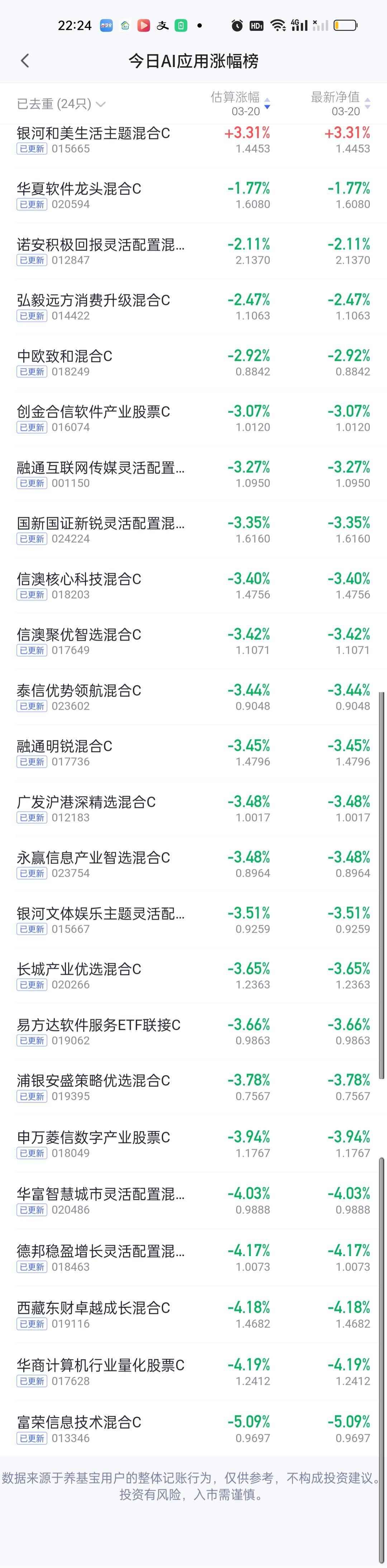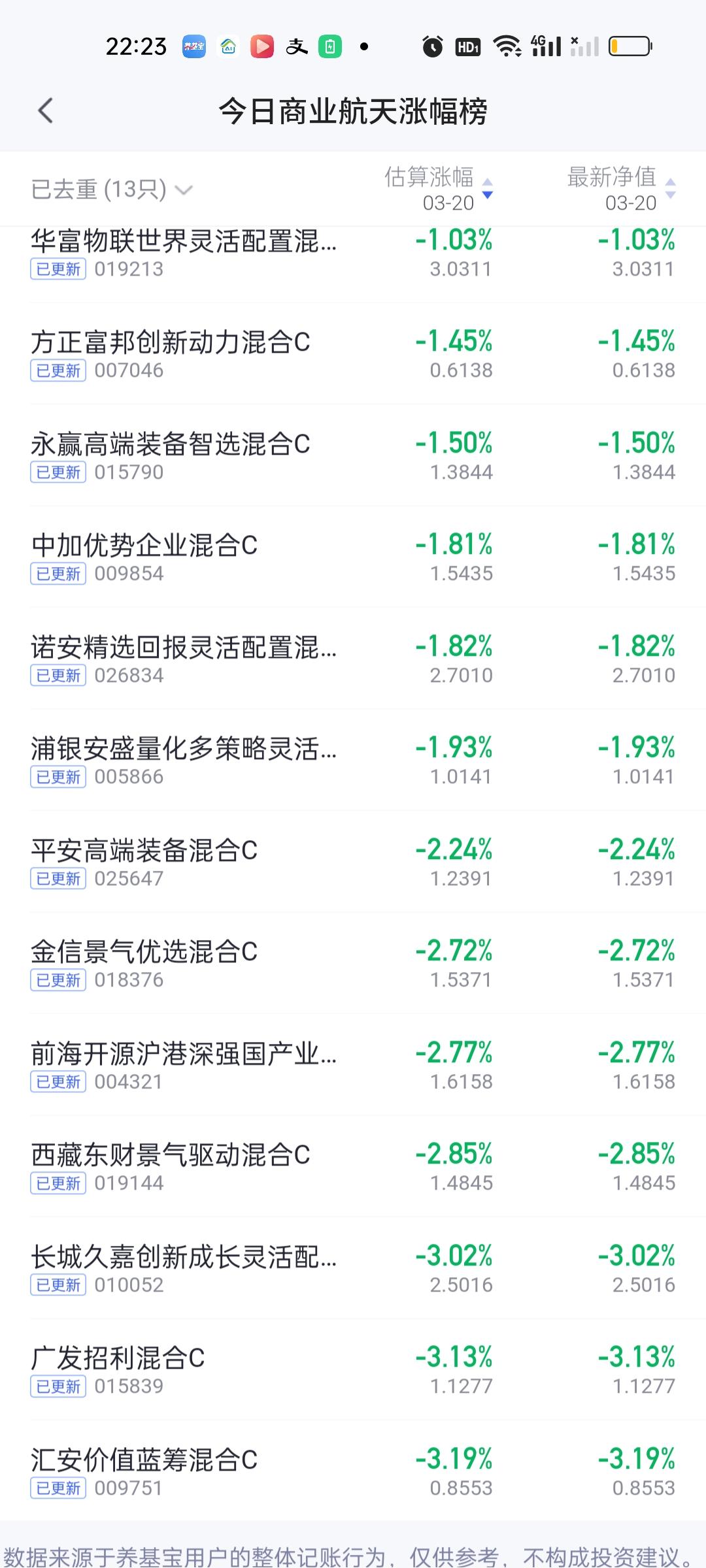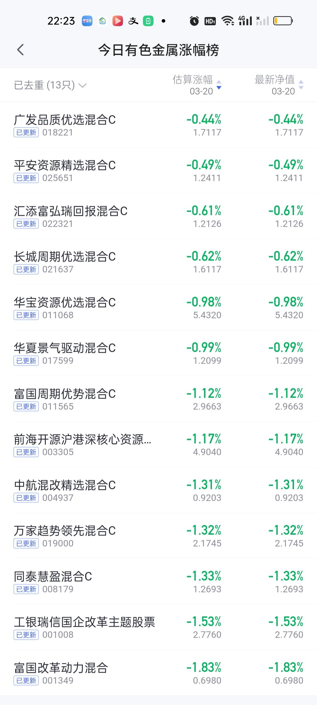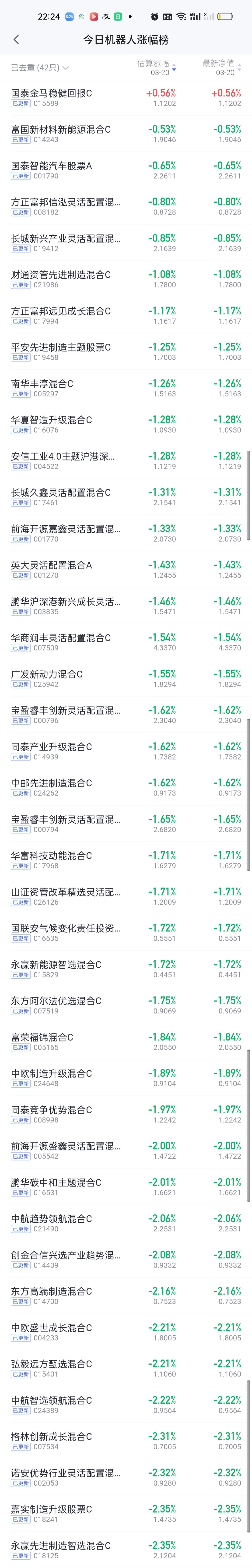 今日基金净值榜已全部更新完毕,可谓有喜有忧。重仓拿着CPO的这一整个月表现都不错。但是拿着其它板块的这个月和这个星期就会很难受。 涨幅榜方面,华宝绿色领先股票5.09%高居第一,银河核心优势4.73%排名第二,财通科技创新4.71%排名第三,浦银安盛数字经济4.70%排名第四,长城久祥4.65%排名第五,信澳业绩驱动4.46%排名第六,财通价值动量4.23%排名第七。 跌幅榜方面,国投瑞银白银期货7.35%排名第一,金信核心竞争力6.14%排名第二,东方阿尔法精选6.11%排名第三,西部利得科技创新5.87%排名第四,东方创新成长5.36%排名第五,西部利得数字产业5.24%排名第六,富荣信息技术5.09%排名第七。 有色金属,商业航天,AI应用,CPO,机器人,创新药涨幅榜一并奉上!