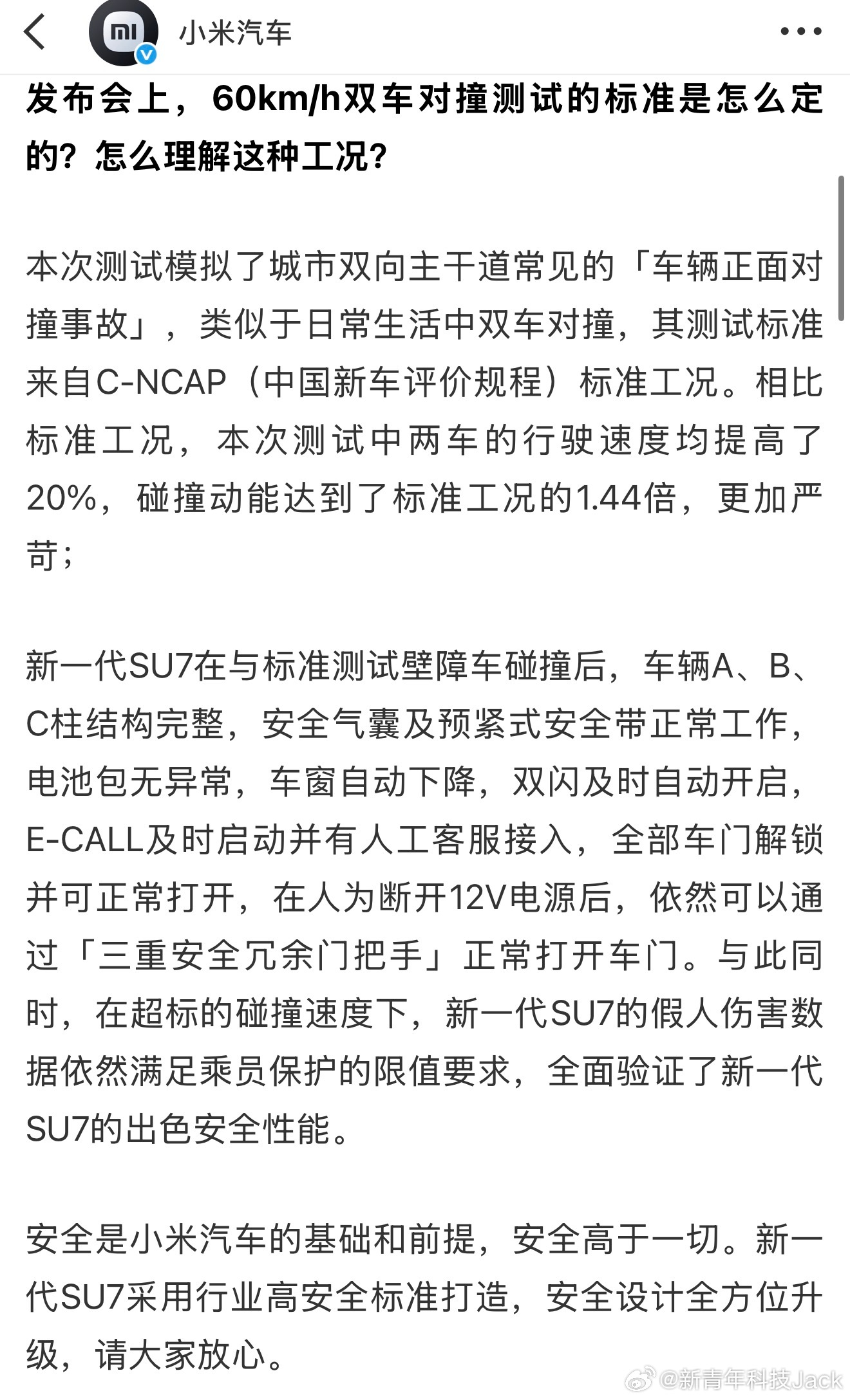 双车50%重叠对撞测试是C-NCAP标准工况,这个标准速度是双车50km/h,小米自己对自己更严格了一些,提升了车速和测试难度,把提升到60km/h,相当于最极端的城市道路环境,本方车辆和对方车辆完全不减速对撞。(简单来说就是被对面撞过来的情况下,车身质量实测更安全更硬更牛逼了。不服的喷子,拿自己开的车按这个相对时速去对撞看看(如果有车的话)自己做不到就别喷小米这样认真造车的车企。)