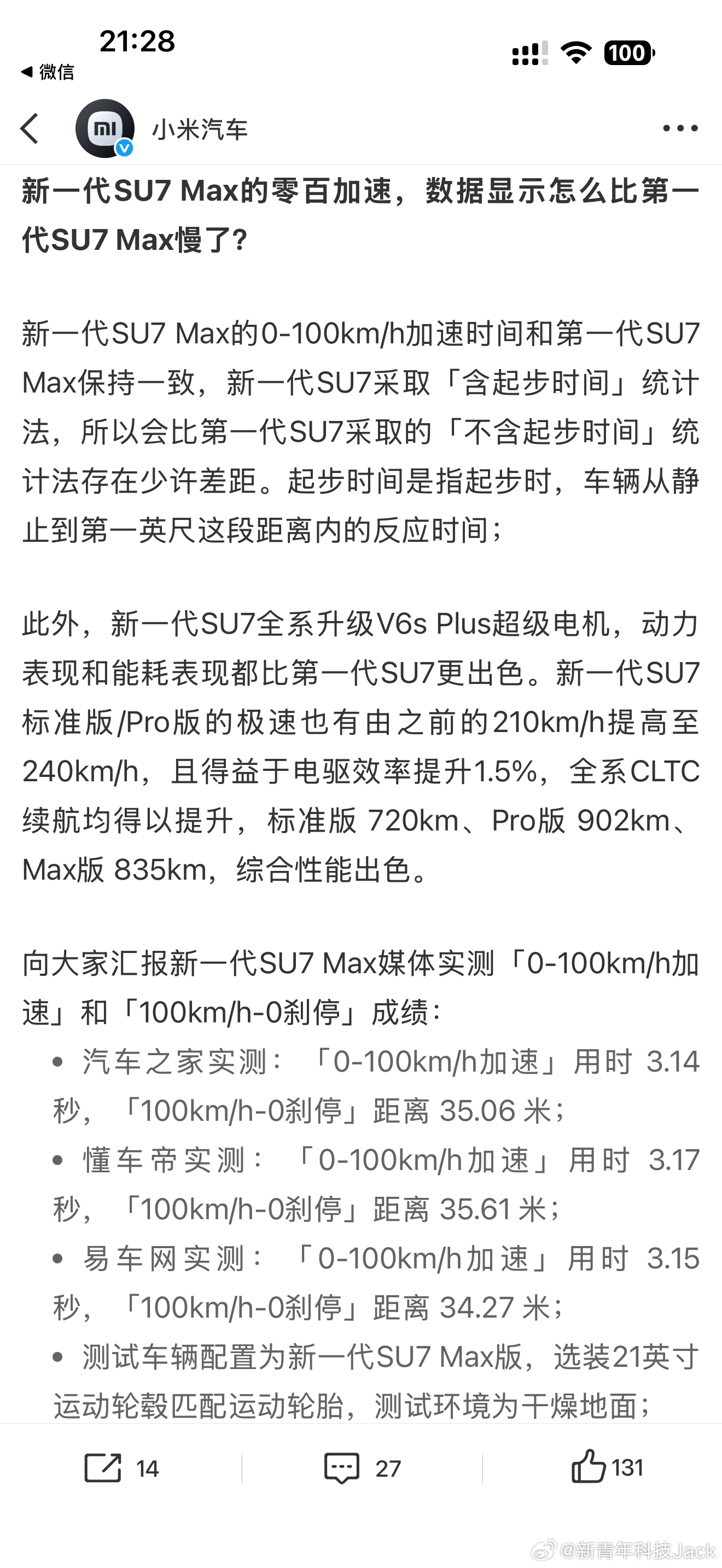 【为什么新一代SU7Max零百加速更慢了?】因为上一代是不包含起步时间,这一代包含了起步时间,实际上的0-100km加速时间是一样的。(之前这个不含起步时间的问题,被一些人骂惨了,这一代直接包含了起步时间😂特斯拉先搞出来的计算方法,就没人骂,第一代小米跟进就被骂了,这下包含了总不能再骂了吧)
