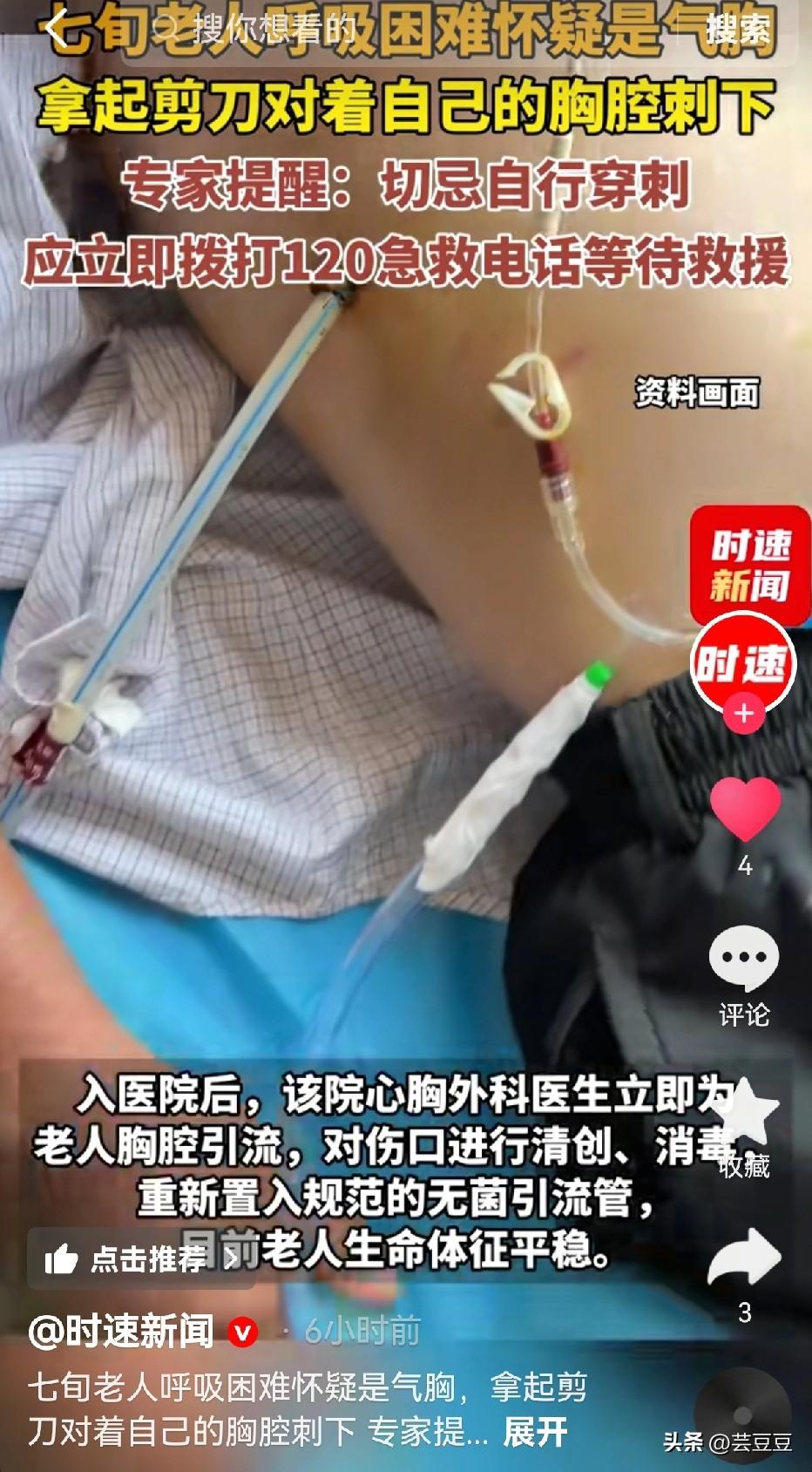 大爷可真是个狠人!呼吸困难,自己拿剪刀捅胸排气,医生看到都倒吸一口凉气!对自己下手太狠了! 3月19日,武汉发生了一件让人胆战心惊的事:一名70多岁的张大爷因慢阻肺引发气胸,突发呼吸困难,竟不顾危险,自行用剪刀捅破胸腔,还自制引流装置排气,所幸送医及时,最终脱离生命危险,但其极端的自救方式,也给所有人敲响了警钟。 张大爷是有着四年病史的慢阻肺老患者,病情逐年加重,反复引发气胸,四年间多次住院治疗,对气胸发作的症状和医学上的排气治疗略有了解。 事发当天清晨,他起床后突然感到胸口闷痛,随后呼吸困难,意识到气胸复发,却没有第一时间拨打急救电话,而是选择了极端的自救方式。 他拿起剪刀,对准此前医院做胸腔引流的结痂部位,狠狠刺入胸腔,随后又让老伴在矿泉水瓶上戳洞,用酸奶吸管连接吸氧管,做成简易引流管插入瓶中,自行给胸腔“排气”。 这套毫无安全保障的“土操作”,让张大爷暂时缓解了不适,却也将自己置于致命危险之中,好在老伴坚决劝阻,才拨打120将其送医。 武汉市第四医院医护人员看到老人胸腔插着自制引流管的场景,都大为震惊。所幸救治及时,医生迅速为老人进行规范胸腔引流,清创消毒并更换无菌引流管,目前老人生命体征平稳。 医生直言,张大爷能脱险纯粹是侥幸。胸腔内有心脏、肺和大量重要血管,擅自穿刺极易刺破血管引发大出血,短短几分钟就可能失血性休克死亡;未灭菌的剪刀、吸管会将细菌带入胸腔,诱发脓胸、败血症;自制装置更无法控制排气速度,反而可能加重病情。 慢阻肺患者本就是气胸高危人群,突发胸闷、呼吸困难时,正确做法是立即拨打120,保持合适体位、及时吸氧,等待专业救治。久病成医是为了配合治疗,绝非自行行医,这种拿生命赌运气的玩命操作,万万不可效仿。 你大爷还是你大爷!就问你们服不服?