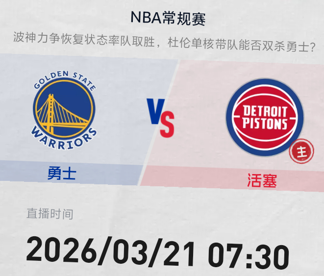明早7:30 金州勇士客战活塞内线争霸 铂金追梦VS杜伦 勇士队能否避免赛季横扫双方预计首发勇士队:波杰 梅尔顿 桑托斯 格林 铂金活塞队:詹金斯 A汤普森 邓罗 哈里斯 杜伦背靠背首战 愿球员们健康完赛金州勇士勇士vs活塞我的观赛搭子