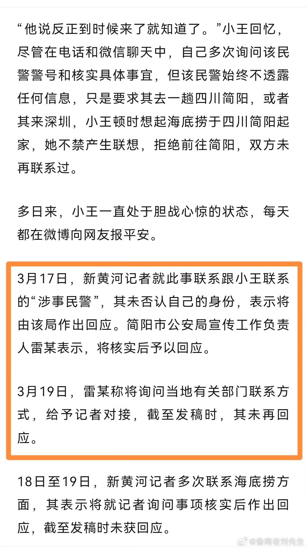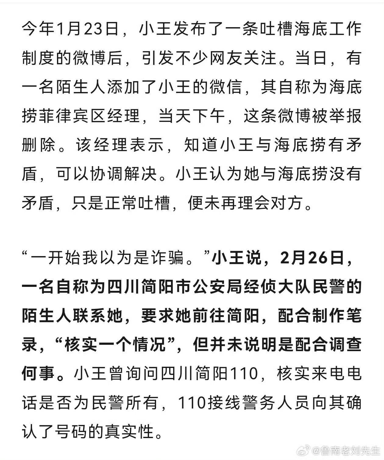 离职员工吐槽知名火锅某捞员工制度不合理,疑似遭到四川简阳警方问询,细思极恐。 一名河南女孩小王,2025 年入职某捞做服务员,因为表现出色,被公司外派到菲律宾某店当大堂经理。在这里服务的半年时间,小王目睹了某捞的对待员工的一些不合理的规章制度,让员工疲于奔命。小王接受不了这种企业文化,选择离职。 2026 年 1 月,小王在微博上时常发文分享他的打工日记,吐槽了某捞的一些日常处罚员工的行为。因为小王的这些吐槽引起了某捞的注意,被投诉到平台删除。 小王本以为事情已经结束,微信加了一个陌生人,要求他去简阳接受问询,或者他们来深圳问询。小王在微信里面核实陌生人的身份,说是简阳经侦一公安,但是在微信里面没有明说具体是什么事情需要问询,小王没有答应前往。 这个事情对于普通人来说,感觉有点恐惧。吐槽一个企业,并不违法,怎么会有公安介入呢?