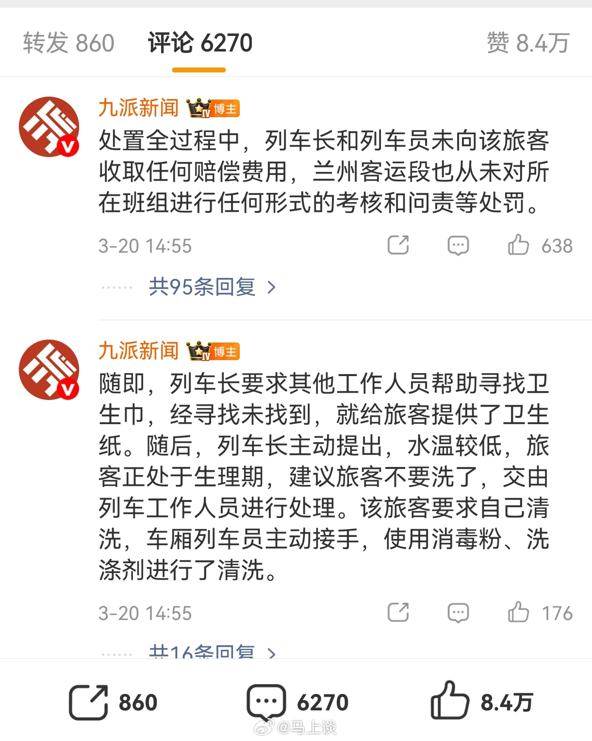 铁路通报女子月经弄脏卧铺事件当事人的回应,证实了和高铁上卖不卖卫生巾无关(事实上