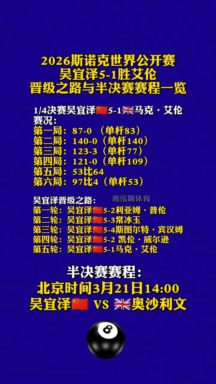 2026斯诺克世界公开赛吴宜泽5-1胜艾伦晋级之路与半决赛赛程一览。 1/4决赛吴宜泽5-1米马克·艾伦。 赛况: ·第一局:87-0(单杆83)。 ·第二局:140-0(单杆140)。 ·第三局:123-3(单杆77)。 ·第四局:121-0(单杆109)。 ·第五局:53比64。 ·第六局:97比4(单杆53)。 吴宜泽晋级之路: ·第一轮:吴宜泽5-2利亚姆·普伦。 ·第二轮:吴宜泽5-3常冰玉。 ·第三轮:吴宜泽5-4斯图尔特·宾汉姆。 ·第四轮:吴宜泽5-2凯伦·威尔逊。 ·第五轮:吴宜泽5-1马克·艾伦。 半决赛赛程:北京时间3月21日14:00。 吴宜泽VS米奥沙利文。