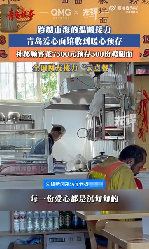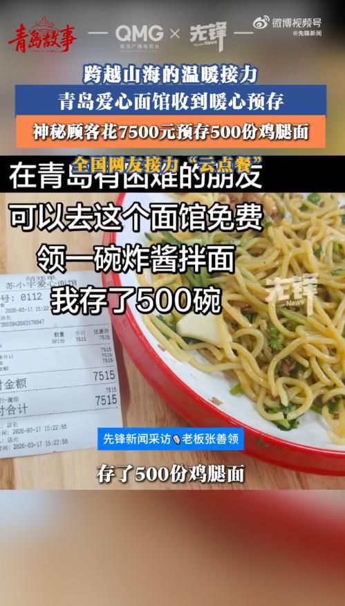 “这才是人间大爱!”3月20日报道,山东青岛,一家新开的爱心面馆,收到了一份沉甸甸的善意,原来是一位神秘顾客一次性预存500份鸡腿面,花费7500元,希望留给有困难的人免费享用。更让人动容的是,面馆开业不到一周,全国各地的网友纷纷通过“云点餐”方式预存爱心面,开启了一场跨越山海的温暖接力。 这家面馆名叫苏小宇爱心面馆,老板是张善领,他的人生过得并不容易。快50岁的他身体有残疾,曾经有过一段幸福的婚姻,妻子是一位聋哑姑娘,两人最大的心愿就是一起开一家属于自己的面馆。 可命运格外残酷,妻子后来确诊癌症晚期,张善领把所有积蓄都拿出来治病,最终还是没能留住她,妻子到最后都没能实现开面馆的心愿。 之后的三年,张善领一个人带着儿子,靠摆早餐摊勉强维持生计,每天天不亮就出门,起早贪黑,尝尽了生活的苦。 但即便如此,他面对工地上的打工人,还是会能少收就少收,总说大家都不容易。 后来,在各方帮助下,他终于圆了和妻子的梦,开起了这家爱心面馆,还立下了两条规矩:身体有残疾、生活过不去坎的人,来店里可以免费吃面;每卖出一碗面,就捐一块钱给聋哑儿童。 或许是张善领的善良打动了别人,才有了那位神秘顾客的暖心举动。而这份善意并没有就此停止,反而像一颗种子,迅速生根发芽。 面馆开业还不到一周,这件事就被传到了网上,全国各地的网友得知后,都被这份温暖打动,纷纷通过“云点餐”的方式,在网上预存爱心面,开启了一场跨越山海的温暖接力。 有人在网上下单,备注里写着“不用做,留给有需要的人”;有人一次性预存好几份,希望能多帮到一些有困难的人;还有人特意留言,鼓励张善领好好把面馆开下去,传递这份温暖。 原本不起眼的一家小面馆,因为这份善意,被来自全国各地的温暖包裹着,成了青岛街头最有温度的地方。 其实,这份温暖从来都不是单方面的付出。神秘顾客的7500元,是善意的起点;张善领在困境中依然选择善良,是温暖的根基;而全国网友的“云点餐”,则让这份温暖跨越了距离,传递到了更多地方。 没有惊天动地的壮举,没有轰轰烈烈的宣传,就是这样一件件平凡又普通的小事,拼凑出了最动人的人间大爱。 张善领说,自己淋过雨,总想给别人撑把伞。这句话很朴实,却道出了善意的本质。 我们每个人都可能遇到困难,都需要被温柔以待,而当我们有能力的时候,伸出援手,给别人一点温暖,这份温暖就会不断传递,照亮更多人的路。
