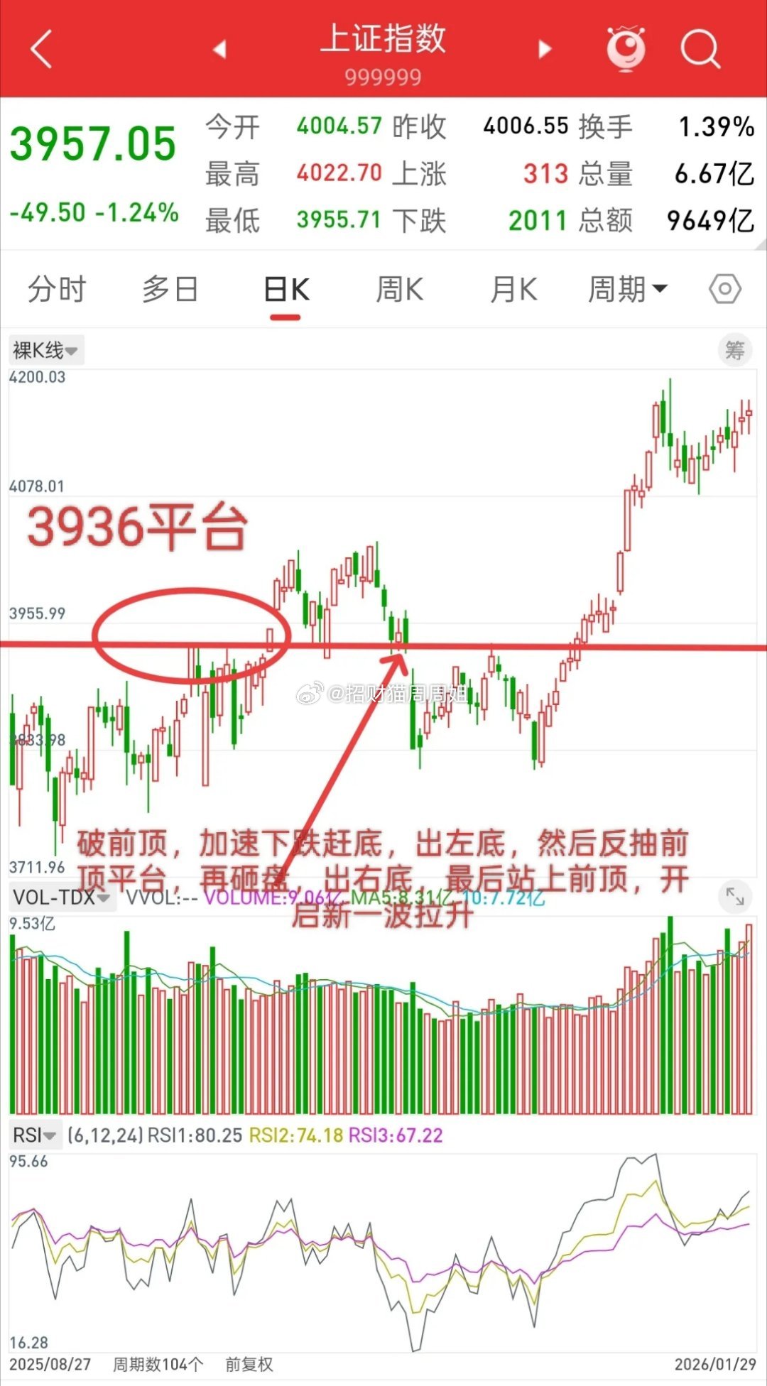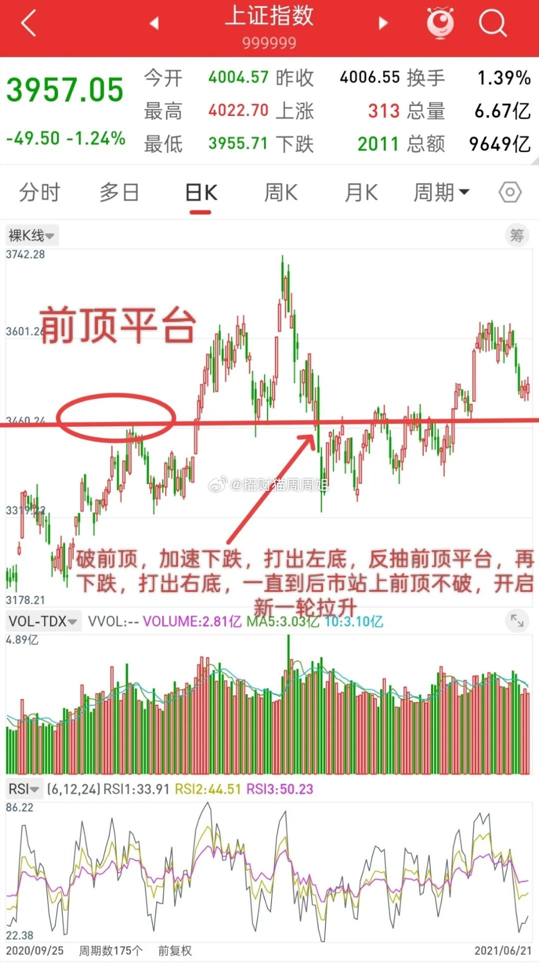 而昨天跌破前顶平台4025,今天周五加速下跌,下周一会不会打出一个新低,也就是左底,我认为大概率。