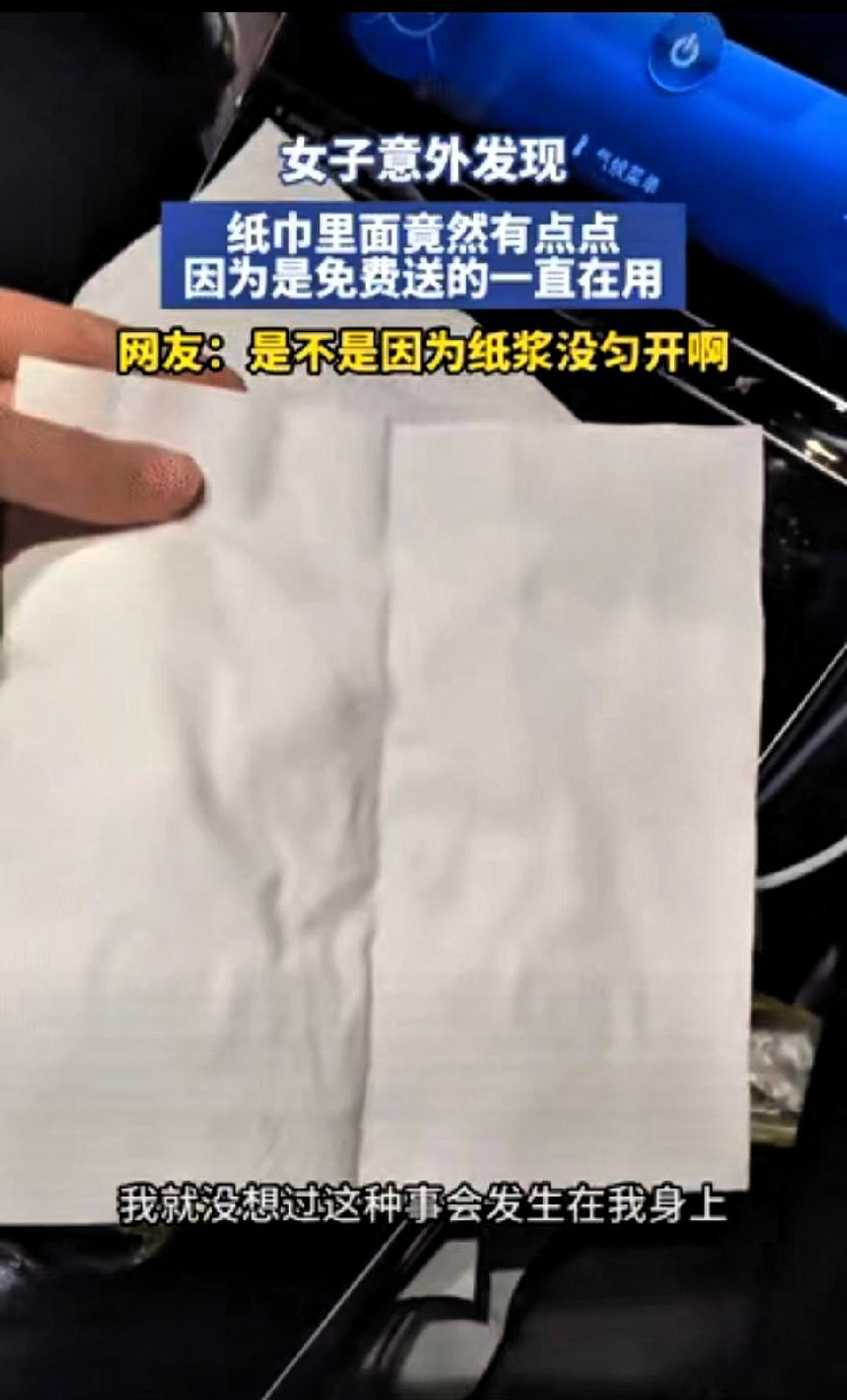 陕西,一女子在高速服务区休息时,突然想上厕所,就拿出了加油站免费送的纸巾,在车内关灯后,才看到纸巾上有不少小黑点,开灯后又不明显,整包纸巾都存在这种情况,让她十分担心。 实际上,低价纸巾出现黑点,大多是因为原料普通、纸浆杂质较多,或是存放过程中受潮分廉价纸巾为了控制成本,生产工艺简单,消毒不到位,长期贴身使用确实不够稳妥。 我们并不是否定所有免费纸巾,而是建议大家分清用途使用。免费纸巾可以用来擦拭物品、清洁污渍,但尽量不要直接接触口腔、面部皮肤,尤其是敏感人群,更要多加注意。 选购纸巾时,不妨多留意包装上的执行标准,这是判断纸巾是否合格的简单方法。日常擦嘴、擦脸建议选择执行标准GB/T20808的纸巾,这类纸巾卫生要求更高,使用起来更放心。如厕使用的纸巾则对应GB/T20810,做到分类使用,更安全也更卫生。 生活中很多小习惯,看似不起眼,却长期影响着我们的健康。贪图一时方便,久而久之可能带来不必要的困扰。正规品牌、信息齐全的纸巾,价格并不高,却能为日常卫生多一层保障。 免费纸巾并非不能用,关键是用对地方、用得合理。重视生活里的小细节,养成健康的使用习惯,比什么都重要。