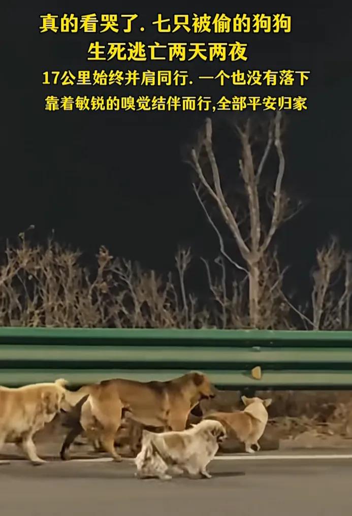7只家犬后续来了!3月16号晚,吉林长春某村7只家养犬,德牧、金毛、拉布拉多、田园犬等被偷狗贼掳走,装上货车转运行至长深高速时,它们集体咬破笼网跳车,瞬间置身车流险境。生死归途17公里,它们没有四散奔逃,而是立刻抱团,在荒野里艰难求生。 货车刚驶离村子时,七只狗被塞进层层叠叠的铁笼,彼此挤得转不开身。刺鼻的麻醉药味混着柴油味钻进鼻腔,平时最活泼的金毛蔫头耷脑趴在笼底,只有德牧还竖着耳朵,死死盯着驾驶室的方向。偷狗贼怕它们叫出声,用粗麻绳勒死了笼门,连透气的缝隙都只留细细一条,黑暗里只剩彼此粗重的呼吸在回荡。 车开上高速的瞬间,颠簸突然变得剧烈,德牧最先挣动起来,用牙齿狠狠啃咬笼门的铁丝。其他狗像是收到了无声的信号,金毛用脑袋顶住笼壁借力,拉布拉多叼住铁丝反复拉扯,连小个子的田园犬都凑过来,用爪子抠着缝隙一起发力。铁丝被磨得发烫,嘴角渗出血丝,却谁也没停下,直到“咔哒”一声脆响,最脆弱的那根铁丝断裂,笼门被撞开一道大口子。 第一只跳下去的是德牧,它借着货车转弯的惯性扑向护栏,重重摔在路面上打了个滚,立刻爬起来回头张望。紧接着金毛、拉布拉多依次跃下,最后两只田园犬被护在中间,由体型最大的狗叼着后颈,小心翼翼放到安全的路边。高速路上车灯晃得睁不开眼,呼啸而过的汽车带起狂风,它们却没有一只往草丛里钻,而是立刻凑到一起,用鼻子互相蹭着确认彼此都还在。 夜色越来越沉,它们沿着护栏一步步往回挪。德牧走在最前面,鼻子贴在地面上嗅着熟悉的气味,金毛和拉布拉多自觉分成左右两翼,把小个子护在中间,遇到坑洼就用身体挡住,怕它们绊倒。饿了啃路边干枯的草根,渴了趴在沟边舔积的雨水,累了就挤在护栏底下打盹,连睡觉都要头对着头,生怕谁在黑夜里走散。 就在它们靠着本能往家挪的时候,心急如焚的主人和志愿者们已经展开了搜救。热心的爱狗人士调来了无人机,在高速沿线的田野和沟渠里反复搜寻,终于在第二天凌晨捕捉到了它们的踪迹。当无人机的灯光扫过那团紧紧依偎的毛孩子时,所有人都红了眼——七只狗浑身沾满泥污,有的爪子磨破了皮,有的耳朵挂着血痕,却还是牢牢守在一起,朝着村子的方向慢慢挪动。 我们总在为狗狗的团结与忠诚感动,可这份感动的底色,本是可以避免的伤害。偷狗贼眼里只有狗肉馆的订单和贩卖的利润,根本不管这些狗是老人的陪伴、孩子的家人。它们不懂什么叫“羁绊”,却用最原始的本能告诉我们:真正的并肩,是明明可以各自逃命,却偏要一起走完整段回家的路。而那些伸出援手的志愿者,也让我们看见,在冰冷的利益之外,还有人愿意为一群不会说话的生命奔走,守住这份温暖的联结。 各位读者你们怎么看?欢迎在评论区讨论。