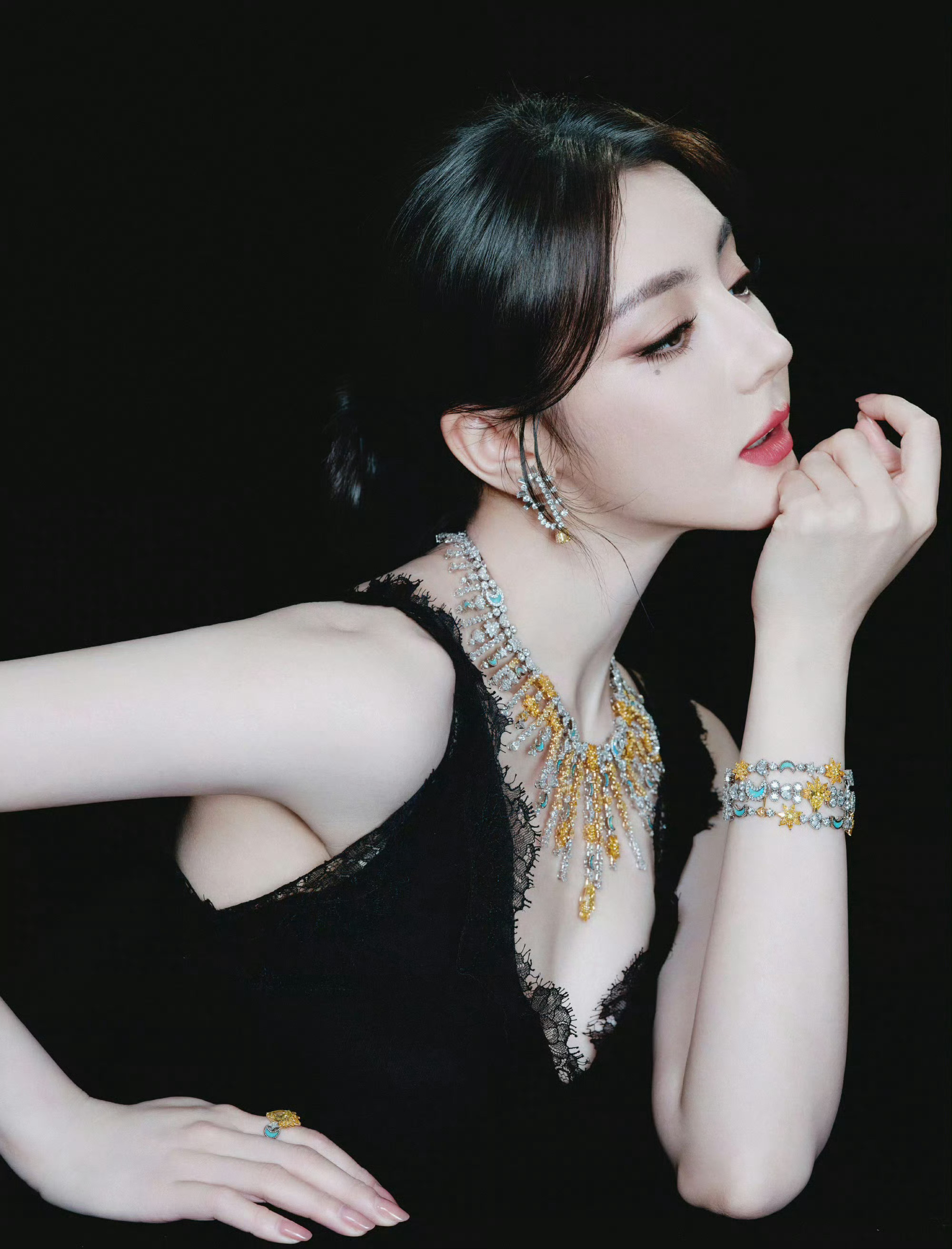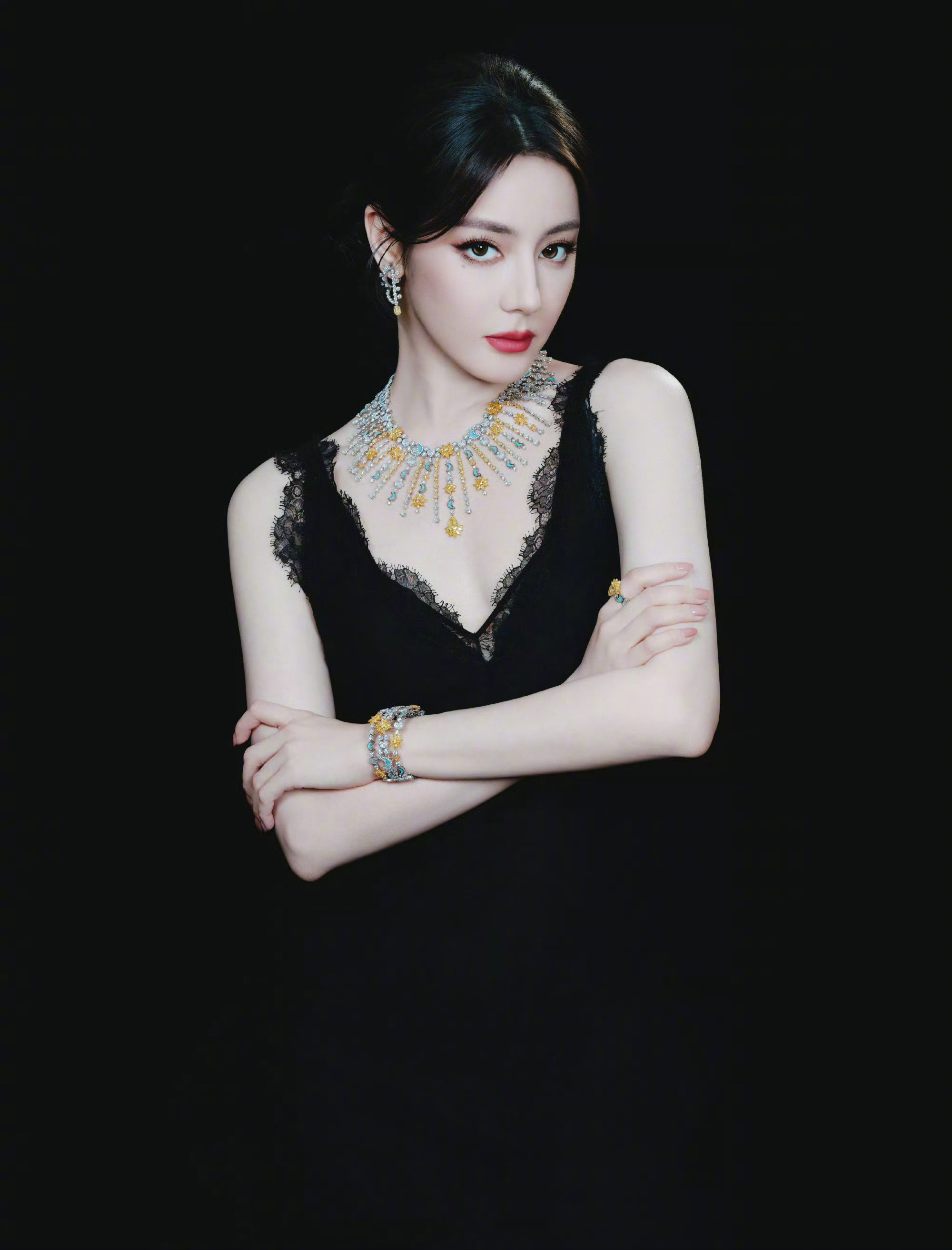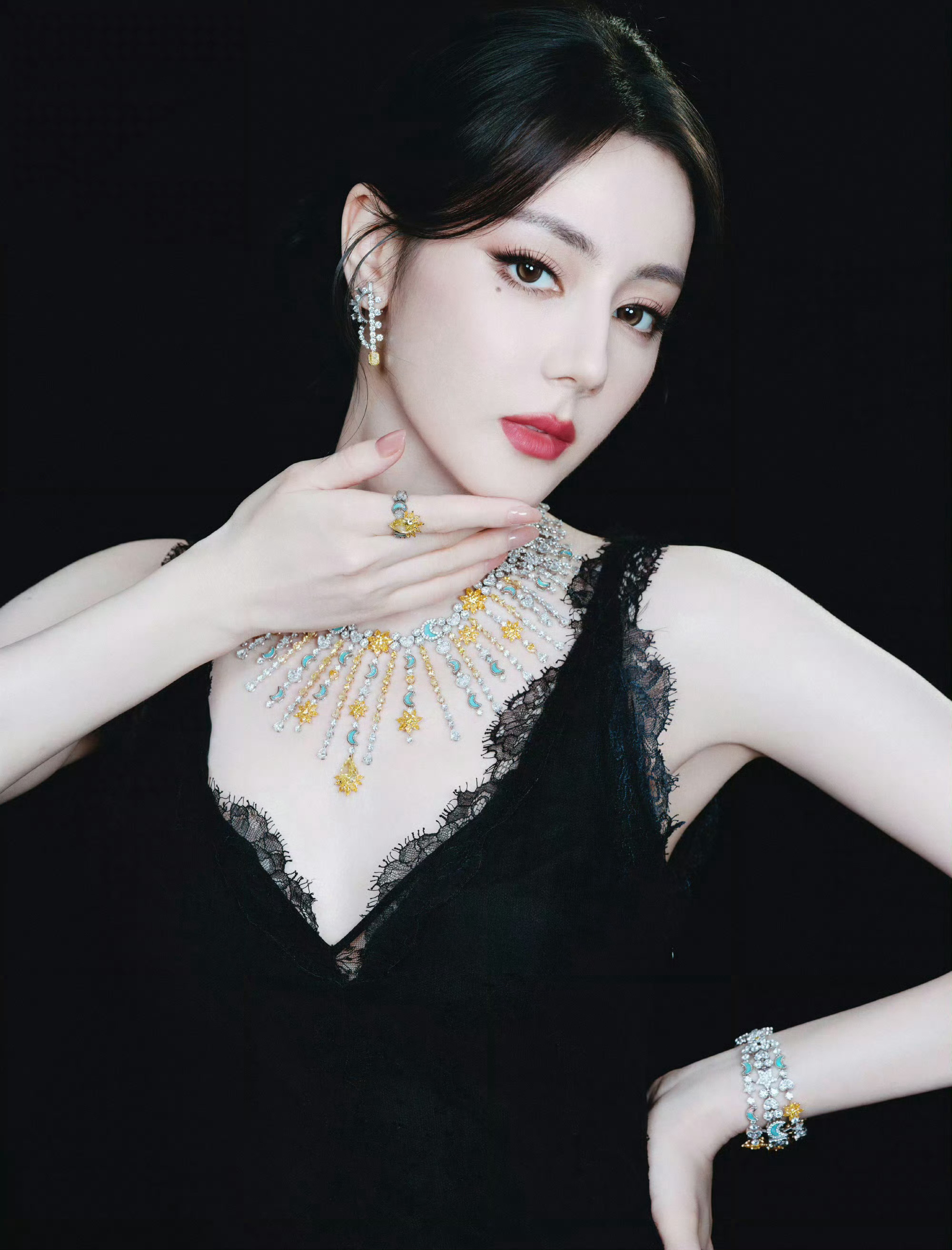 迪丽热巴 in Dior 🖤👑 今日晚宴活动造型大片,一袭蕾丝黑色蕾丝裙,佩戴Belle Dior高级珠宝,高贵优雅的女王气场。
