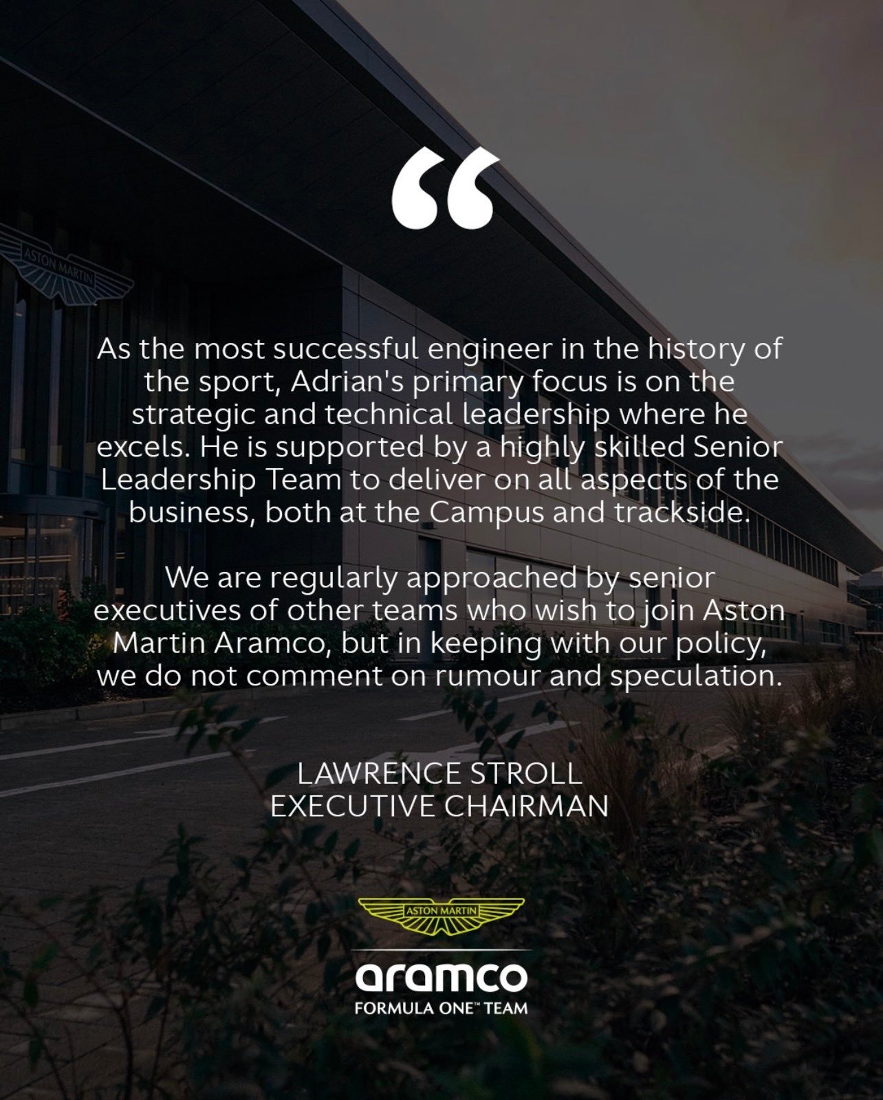 阿斯顿马丁老板劳伦斯-斯托尔发表了一份官方声明,重申对于技术合伙人阿德里安-纽维的信任,他表示阿斯顿马丁没有采用传统车队领队的角色,纽维主要将专注于他更擅长的战略和技术领域。不过他不会就近期的传闻和猜测发表评论。