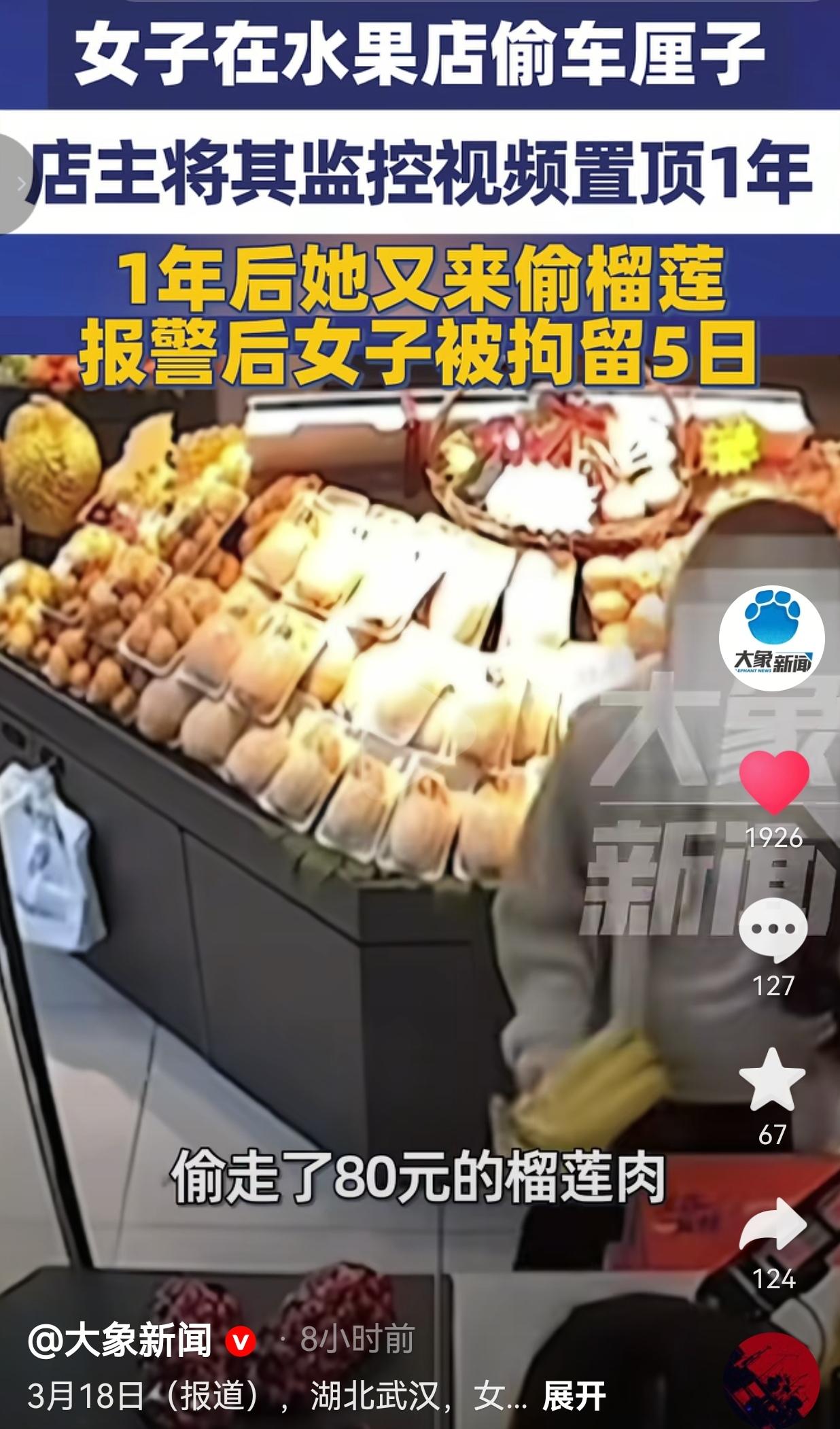 太离谱了!偷车厘子被店主挂监控1年,她居然又回来偷榴莲?! 湖北武汉一女子,把同一家水果店当自家菜园子,偷完车厘子偷榴莲,脸都不要了! 一年前,她鬼鬼祟祟溜进这家水果店,趁店员不注意,揣了一把车厘子就溜。店主气不过,直接把她偷东西的监控视频置顶在店里,一挂就是整整一年,明摆着告诉所有人:这人是小偷,别让她再进来! 谁能想到,一年后,她居然大摇大摆又回来了!这次更嚣张,直接伸手偷了价值80块的榴莲肉,以为店主忘了?以为监控没开?结果全程被拍得一清二楚!店主忍无可忍直接报警,这姐们儿最终被行政拘留5天,还得现场把偷的榴莲钱赔了。 网友看到后评论说:“这是记性不好还是脸皮太厚?偷一次被挂一年,还敢来?我家猫偷了小鱼干被骂一次都不敢靠近厨房了!” 也有的网友说:“80块的榴莲肉,换5天拘留,这账怎么算都亏到姥姥家了!图啥啊图?图里面管饭? 也有的网友说:“店主也是实在人,没打没骂就挂监控,已经仁至义尽了,她倒好,纯纯不知悔改!” 还有的网友说:“真给女人丢脸!想吃不会买?穷到连80块都拿不出来?宁愿偷都不愿好好挣钱,活该进去待几天!” 我真的越看越气!这已经不是“贪小便宜”能形容的了,这是纯纯的不要脸+不知悔改! 店主把监控挂一年,不是为了羞辱谁,是为了防着她再偷,也是给其他顾客提个醒。 结果她倒好,完全无视这份“警示”,把别人的宽容当自己放肆的资本。80块钱的榴莲,说贵不贵,但这背后是对他人劳动成果的践踏,是对规则的公然挑衅。 你说她穷?那更该靠自己双手去挣,而不是靠偷!偷来的东西吃着能香吗?晚上睡觉能踏实吗?被警察带走的时候,看着周围人指指点点的眼神,真的就一点都不害臊吗? 这种人,最可怕的不是偷东西,是骨子里的侥幸和麻木——觉得偷一次没被重罚,就敢偷第二次;觉得别人挂监控是小题大做,就敢继续挑战底线。殊不知,每一次伸手,都是在把自己往更深的坑里推,直到最后撞得头破血流。 最后我想的说:别把“脸皮厚”当本事,别把“不知悔改”当个性。 伸手必被捉,作恶必被惩,这从来都不是一句空话。 偷来的一时满足,换不来一生心安;不要脸的嚣张,终会撞碎在法律的墙上! 对此,你怎么看?