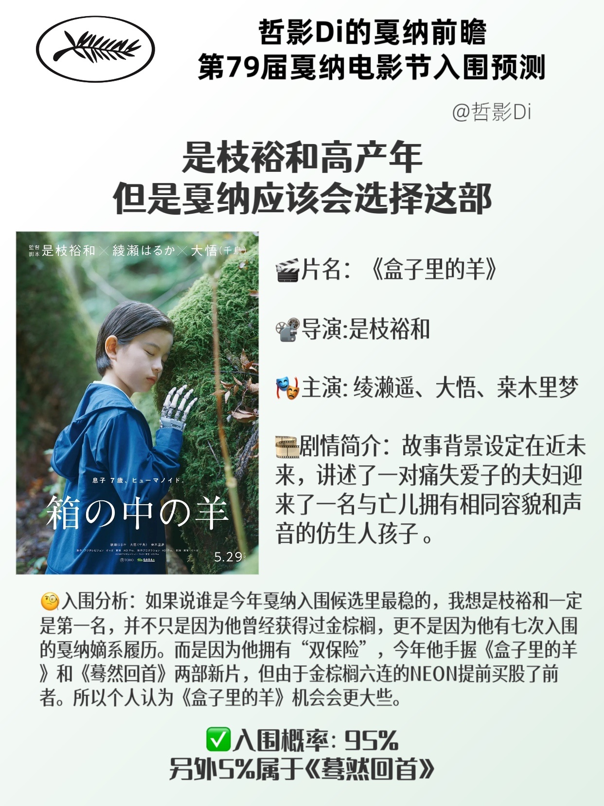 🧐入围分析:如果说谁是今年戛纳入围候选里最稳的,我想是枝裕和一定是第一名,并不只是因为他曾经获得过金棕榈,更不是因为他有七次入围的戛纳嫡系履历。而是因为他拥有“双保险”,今年他手握《盒子里的羊》和《蓦然回首》两部新片,但由于金棕榈六连的NEON提前买股了前者。所以个人认为《盒子里的羊》机会会更大些。✅入围概率:95%(另外5%属于《蓦然回首》)