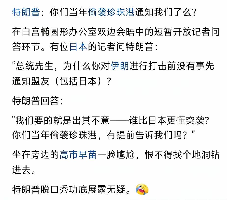 这个日本记者可能仕途也就到此为止了吧? “我们要的就是出其不意——谁比日本更懂偷袭?你们当年偷袭珍珠港,有提前告诉我们吗?”年度最佳脱口秀演员特朗普一句话,把高市早苗尬到抠地。起因就是这个日本记者追问特朗普,“为啥打伊朗前不通知我们盟友?” 谁能想到,这个问题恶化成了对小日本的大型公开处刑现场?还是当着首相高市早苗的面。 现场记者笑成一片,这个时候高市早苗的表情管理不失控才怪,你踏马这是哪壶不开提哪壶啊!特朗普的这句回答,不亚于当年小孩子产生的威力啊! 说到底,所谓“美日同盟”,不过是美国随时能揭伤疤的“小弟”罢了。高市早苗这趟白宫行,老美的高规格接待给足了面子,同时也把面子扔地下踩了又踩,这事怕是也只有特朗普能做出来的吧! 特朗普 高市早苗 美日同盟 珍珠港