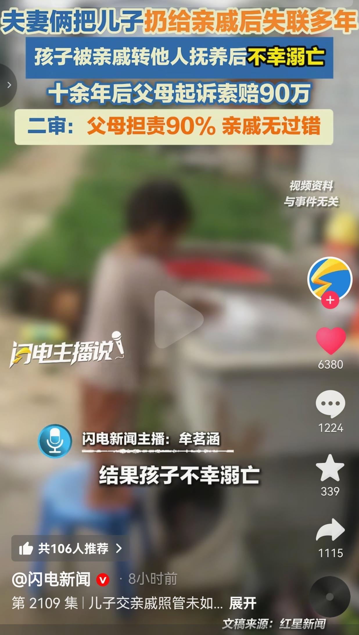 真的让人心里五味杂陈,又气愤又唏嘘。山东一对夫妻,当年将年仅1岁的亲生儿子托付给亲戚照看,之后便长期失联,对孩子不管不问。 孩子不幸离世十年后,这对父母突然出现,竟将曾经好心照料孩子的亲戚告上法庭,索赔90万元。所幸二审法院公正判决,由孩子父母承担90%的主要责任,好心帮忙的亲戚无需担责。 当年,王某夫妇外出务工,将刚满1岁的儿子交给亲戚帮忙照顾。双方就抚养费用协商未果后,孩子便一直留在亲戚家中。这对父母在此期间仅给过400元,之后便彻底失去联系。 亲戚独自一人悉心照料孩子四年,生活压力实在难以承受,又始终联系不上孩子的亲生父母,无奈之下,只能向村委会说明情况,将孩子转由同村的聂某继续抚养。 令人痛心的是,没过多久,孩子便意外溺水身亡。 谁也没有想到,在孩子离开人世整整十年之后,他的父母突然出现,一纸诉状将当初帮忙照顾孩子的亲戚和聂某告上法庭,要求赔偿90万元,还声称对方未尽到监护责任。 一审法院判决孩子父母承担80%的责任,亲戚与聂某共同承担20%。即便如此,这对父母依旧不服,坚持提起上诉。 最终二审法院给出了公正的结果:孩子的父母作为法定监护人,长期失联、拒不履行抚养义务,应承担90%的主要责任;好心帮忙的亲戚无任何过错,仅由聂某承担10%的责任,赔偿8.7万余元,依法驳回了孩子父母的其他不合理诉求。   网友看到后评论说:“实在让人难以接受,生而不养,孩子不在了却来主张赔偿,当初为人父母的责任去哪了呢?” 也有的网友说:“真心替这位亲戚委屈,无偿照顾孩子四年,只拿到400块钱,最后还要被牵连,实在太让人心寒。” 也有的网友说:“孩子在世时不闻不问,离世后能索赔了便立刻出现,实在让人难以认同。” 还有的网友说:“如果父母能尽到监护责任,孩子或许不会是这样的结局,出了问题推卸责任,实在不应该。”   看完整个事件,心里满是感慨。 即便生活有诸多不易,也不能成为放弃抚养、抛弃亲生骨肉的理由。 一个刚满1岁、还在牙牙学语的孩子,被托付他人后便无人过问,连基本的抚养费都难以保障,实在让人痛心。 亲戚已经尽己所能照料孩子四年,在无力继续抚养时,也依规向村委会报备并妥善转交,全程出于善意、未求回报,本就不该为亲生父母的失职承担后果。 最让人唏嘘的是,孩子在世时,父母杳无音信;孩子离世多年后,却以亲人的身份出现索要赔偿,这样的行为实在难以让人认同。 法院的二审判决,守住了公平与正义,也让好心之人没有白白受委屈。 其实很多时候我们都明白,生活再难,也不能放弃为人父母的责任。 有人为了孩子倾其所有、默默守护,也有人将孩子视作负担,甚至在悲剧发生后试图谋求利益。 为人父母,或许不必经过考试,但责任与良知不能缺位。你可以选择不生育,但既然把孩子带到这个世界,就应尽到守护与抚养的义务,一时的逃避,终究换不来长久的心安。 不要等到悲剧无法挽回,才想起自己为人父母的身份,到那时,再多的后悔也毫无意义。 生而不养,愧对父母之名;离世索赔,更难安内心良知。 对此,你怎么看? 信息来源:闪电新闻