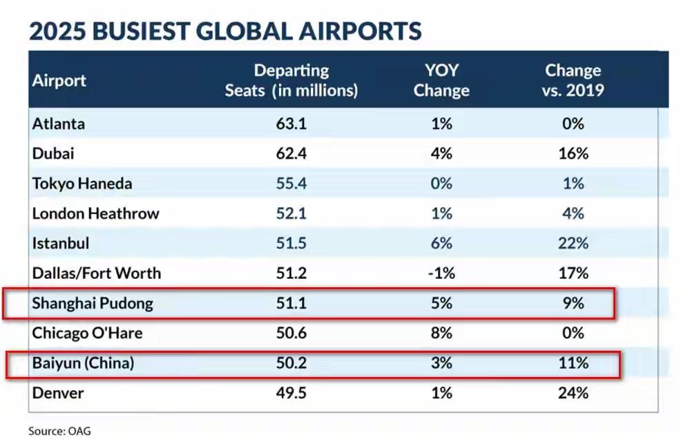 2025年上海浦东、广州白云国际机场入围全球最繁忙TOP 10机场 1、美国 亚特兰大哈茨菲尔德-杰克逊国际机场(ATL):106,302,208 2、阿联酋 迪拜国际机场(DXB):95,200,000 3、日本 东京羽田机场(HND):91,430,000 4、美国 达拉斯-沃斯堡国际机场(DFW):85,660,100 5、中国 上海浦东国际机场(PVG):84,994,548 6、美国 芝加哥奥黑尔国际机场(ORD):84,851,825 7、英国 伦敦希思罗机场(LHR):84,463,000 8、土耳其 伊斯坦布尔机场(IST):84,457,421 9、中国 广州白云国际机场(CAN):83,582,952 10、美国 丹佛国际机场(DEN):82,427,962 注:图五、九为上海浦东、广州白云国际机场↓↓↓