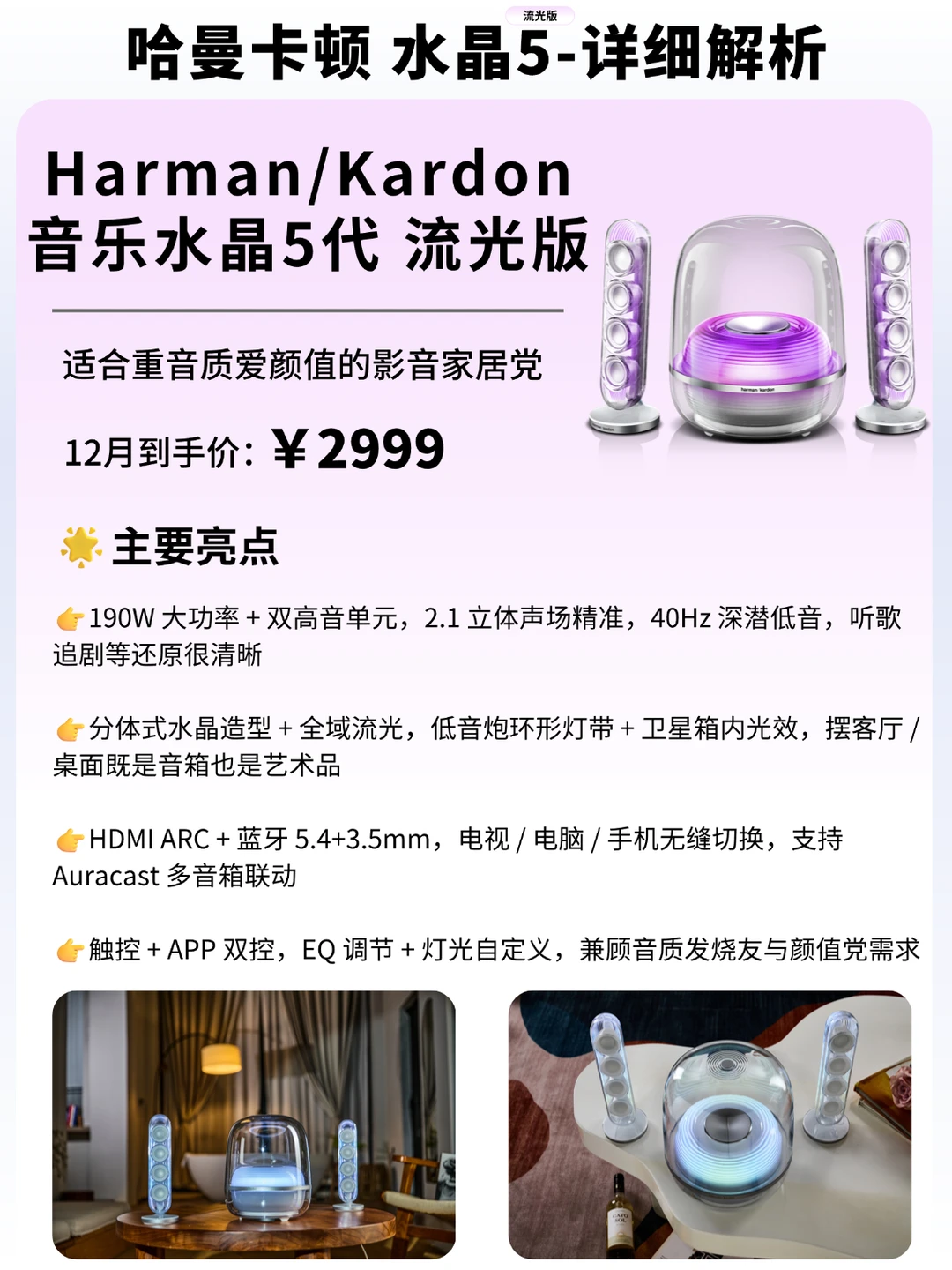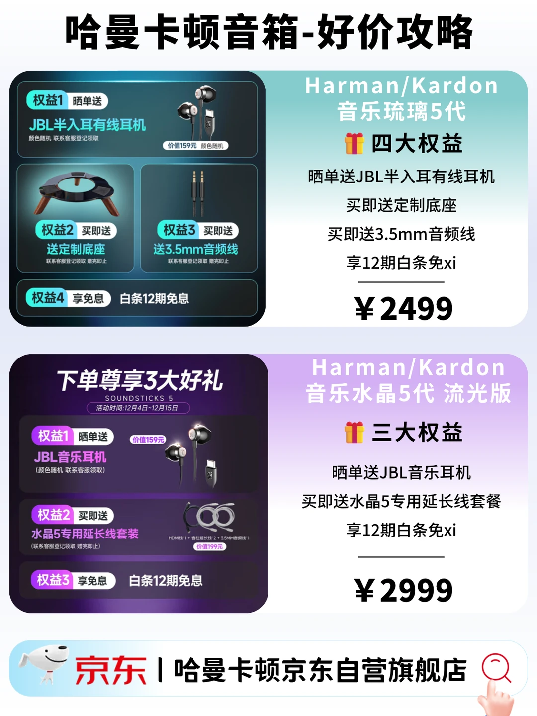 双旦想入音箱自用,或纠结送礼选什么的宝子,直接看这篇!今天带来哈曼卡顿两款热门型号的详细分析,按需求选择不踩雷! 🔹 琉璃 5 ✨️主打 “颜值 + 氛围” 双在线,一体式水母造型不占地儿,摆客厅、卧室、玄关都不挑装修风格,关机也是个精致摆件 ✨️360° 恒定声场很实用,房间任意角落听感都均匀,不会近听刺耳远听模糊,日常听歌、追剧、看综艺完全够用 ✨️5 种柔光效随音乐律动,亮度柔和不刺眼,晚上开着听歌、放松超治愈,送礼送乔迁也不容易出错 ✨️操作简单,插电即⽤,蓝牙 5.4 连接稳定,爸妈、长辈用也能上手 🔹 水晶 5 流光版 ✨️分体式 2.1 声道(1 个低音炮 + 2 个卫星箱),立体声层次超清晰,打游戏能听声辨位,看电影有临场感 ✨️190W 大功率 + 双高音单元,低音下潜深不轰头,人声、乐器细节还原到位 ✨️新增 HDMI ARC 接口,连电视、电脑无延迟,影音娱乐体验直接升级 ✨️全域流光设计,低音炮 + 卫星箱都带灯效,摆桌面既有设计感又有科技感,颜值党 + 音质党双满足 ✅️总结 ● 看重氛围、送礼百搭、日常居家→ 琉璃 5 ● 追求音质、影音党、游戏党→ 水晶 5 🎁哈曼卡顿12月专属权益 ✅ 琉璃 5: 晒单送JBL半入耳有线耳机、买即送定制底座、买即送3.5mm音频线、享12期白条免xi ✅水晶 5 流光版: 晒单赠 JBL 有线耳机、买即送专用延长线套装、享 12 期白条免xi 直接去某东就能冲~ 双旦前入手刚好能当节日礼、乔迁礼,质感够足,收到的人绝对夸你会选!