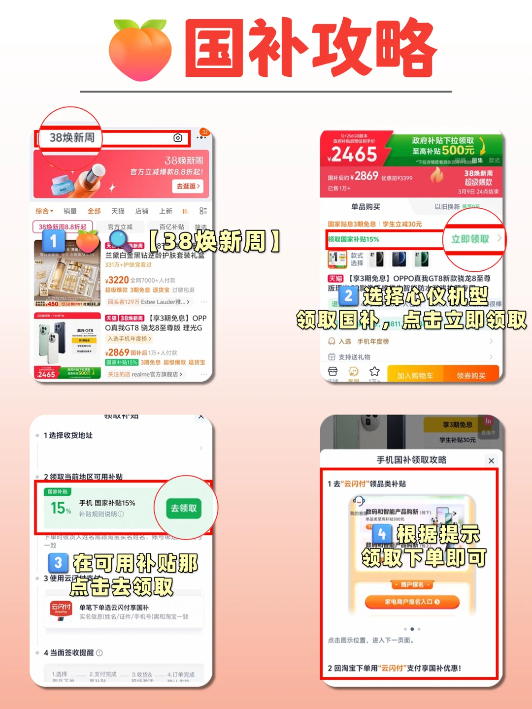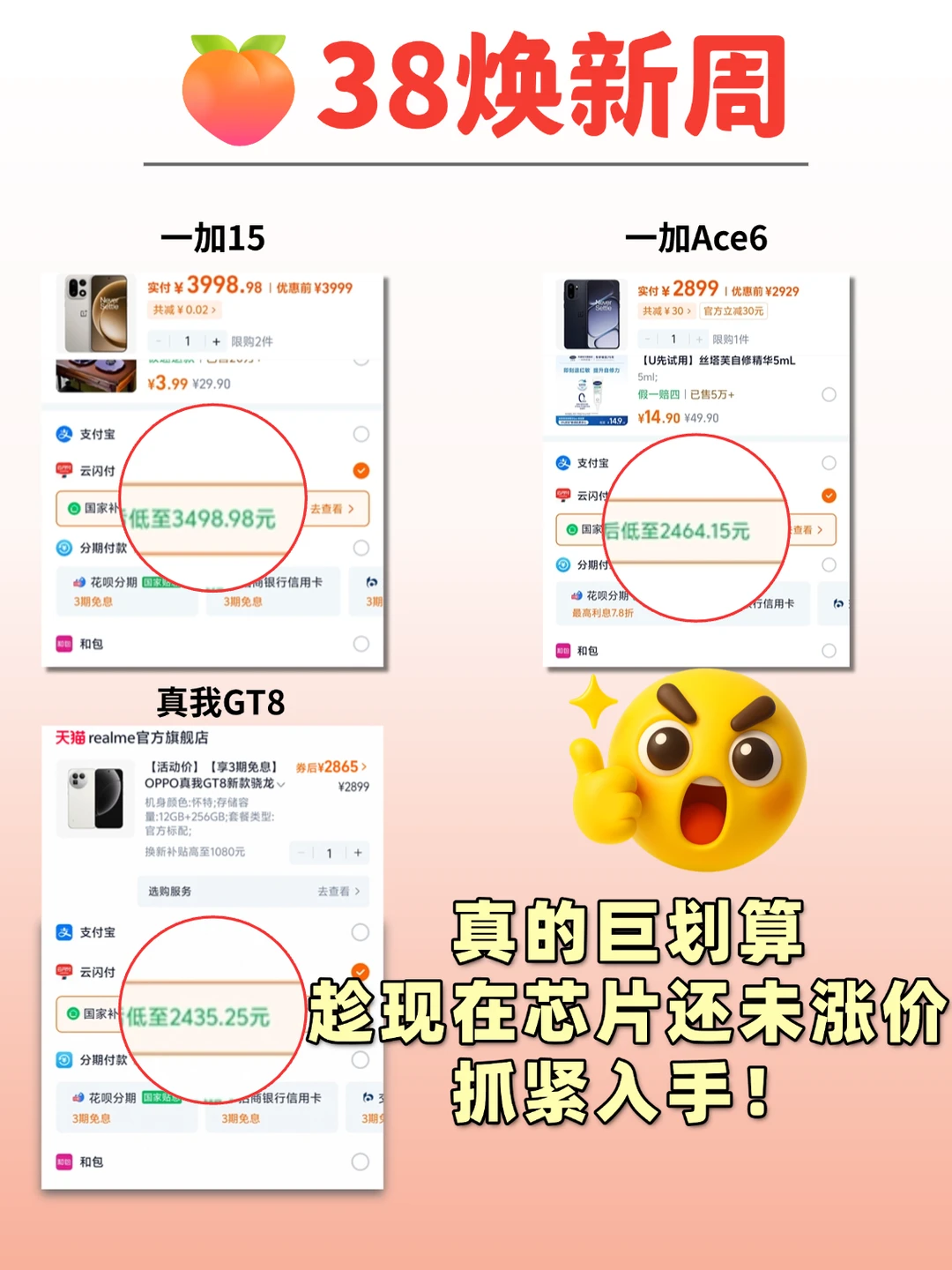 最近有换机打算的朋友可以多留意了📱,近期存储芯片价格进入上行周期,行业内手机产品后续有调价预期 想要入手新机的话,当下🍑 38 焕新周就是非常合适的时机,官方优惠叠加国家补贴,能实实在在省下不少预算~ 👇给大家整理了几款热门机型的核心信息: ✅一加 15:综合体验拉满的旗舰机型,配置均衡质感出众,原价 3999 元起,国补后到手价 3499 元起,叠加活动优惠后性价比非常突出🔥 ✅OPPO Find X9:高端影像旗舰,颜值、性能与影像实力都在线,原价 4399 元起,国补后到手价 3899 元起📸 ✅一加 Ace6:实用均衡的性价比机型,日常使用流畅稳定,原价 2999 元起,国补后到手价 2464 元起💡 ✅真我 GT8:搭载骁龙 8 至尊版处理器,性能表现强劲,原价 2899 元起,国补后到手价 2465 元起,优惠后低至 2435.25 元🚀 [烟花R]这次活动的核心福利也给大家整理清楚了,不用自己再挨个找: 国补最高 15%💰 38焕新周官方立减叠券7.7 折起🎁 双重优惠折上折💥 有换机需求的朋友,可以趁这个活动好好挑选,早买早享受,别一等再等,涨价了才入手⏳