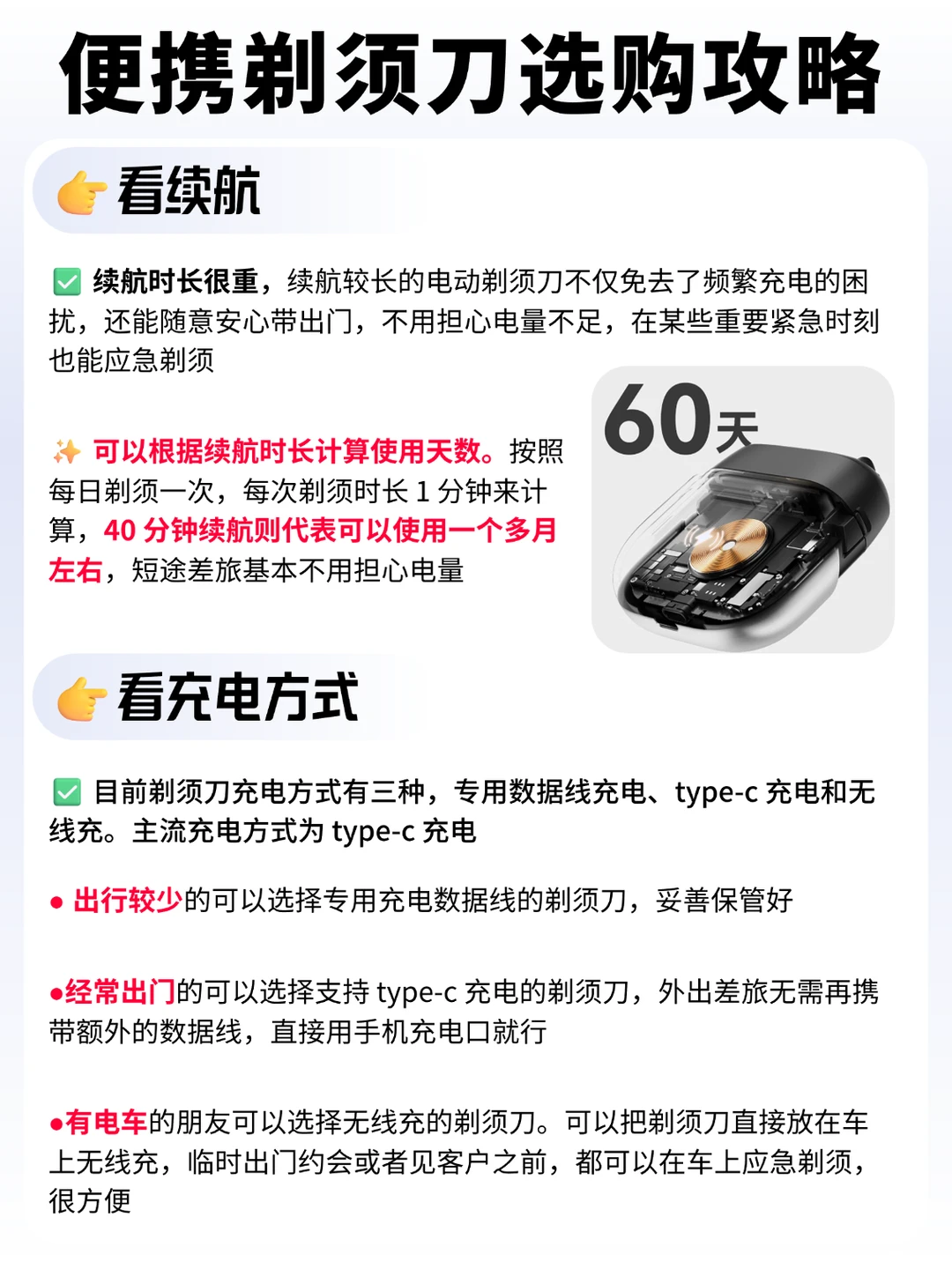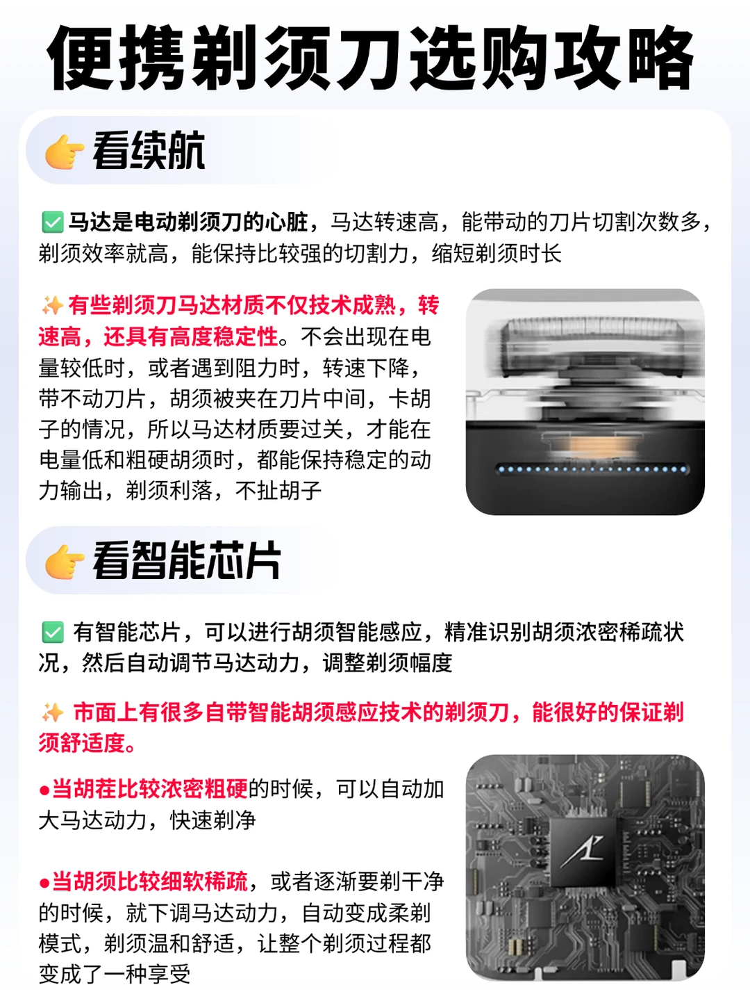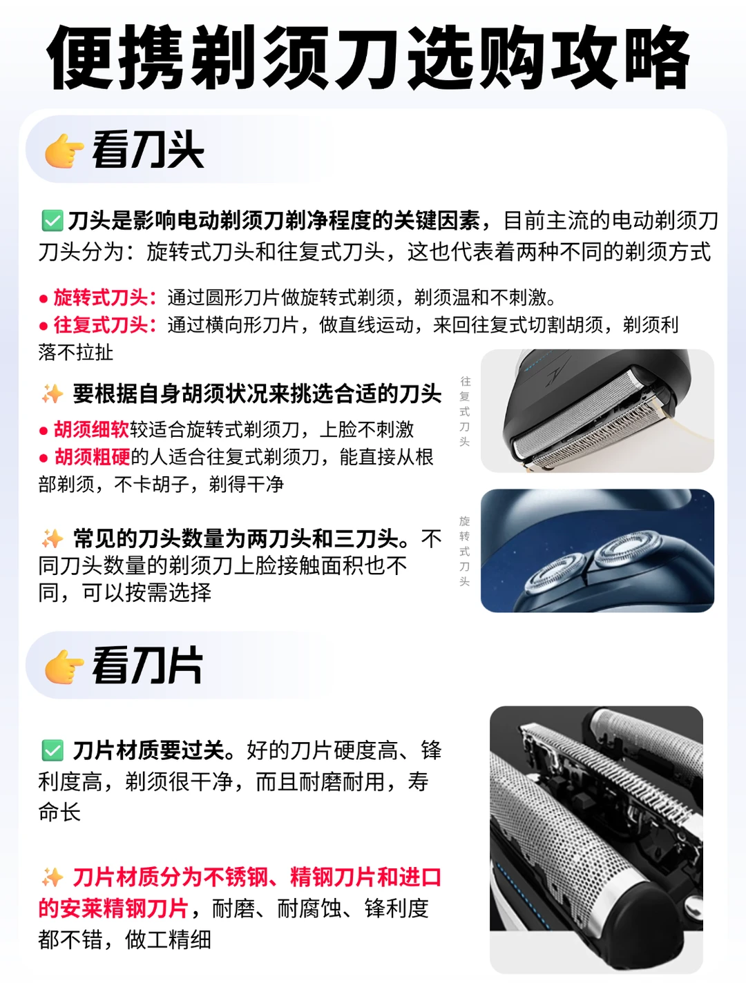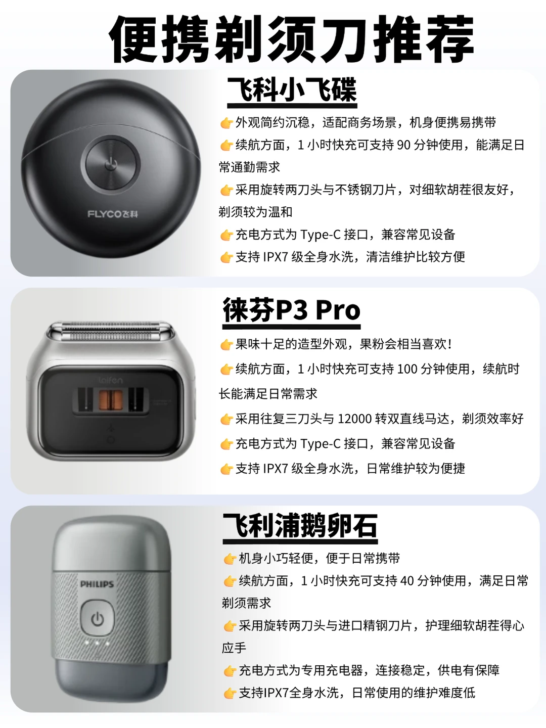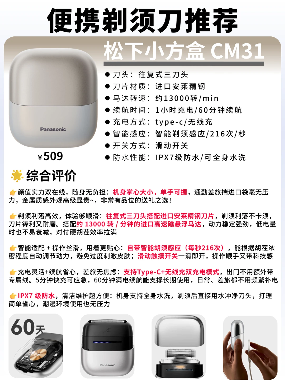 有没有宝子和我一样,选便携剃须刀总踩坑:揣兜沉、剃不干净、充电麻烦… 今天 4 款热门机型实测,看完直接抄作业! 便携剃须刀要看哪些?(具体可看 P2-P4) ✅看刀头 ✅看刀片 ✅看续航 ✅看智能芯片 ✅看续航 ✅看充电方式 四款机型综合评价 🔹 松下小方盒 CM31 ✨掌心大小仅比蓝牙耳机盒大一圈,单手可握随身无负担 ✨Type-C + 无线充双模式,5min 快充应急,60 天续航无电量焦虑 ✨往复式三刀头 + 进口安莱精钢刀片,13000 转高速磁悬浮马达,粗硬 / 细软胡茬都能剃净不留黑点,还有AI 智能胡须感应自动调动力,剃感顺滑 ✨金属机身精致显贵,松下大牌用着有面,滑动解锁,一滑即开,科技感足还防误触 ✨IPX7 全机水洗,用完冲一冲就干净,日常清洁省心又卫生 🔹 飞科小飞碟 ✨️ 飞碟造型简约便携,塞公文包不占地,Type-C 快充适配手机线 ✨️ 双弧面刀头贴合面部,对付细软胡茬够用,IPX7 水洗支持干湿双剃 🔹 飞利浦鹅卵石 ✨️ 鹅卵石迷你机身,揣兜随身带无压力,3D 回弹刀头剃须轻柔适配细软胡茬 ✨️ 5 分钟闪充可应急,支持全身水洗清洁省心 🔹 徕芬 P3 Pro ✨️ 机甲风外观吸睛,航空级机身质感在线;12000 次 / 分钟切割动力强劲 ✨️ Type-C 快充 + 100 分钟续航,IPX7 防水 + 旅行防误触 ✅️总结 ● 差旅多、胡茬粗细都有、要长续航 + 智能剃感 → 闭眼冲松下小方盒 CM31 ● 商务通勤、喜欢简约风 → 飞科小飞碟 ● 短途出行、胡须细软 → 飞利浦鹅卵石 ● 看重潮流、科技感 → 徕芬 P3 Pro 还有什么不懂的宝子可评论区提出喔,有问必答~