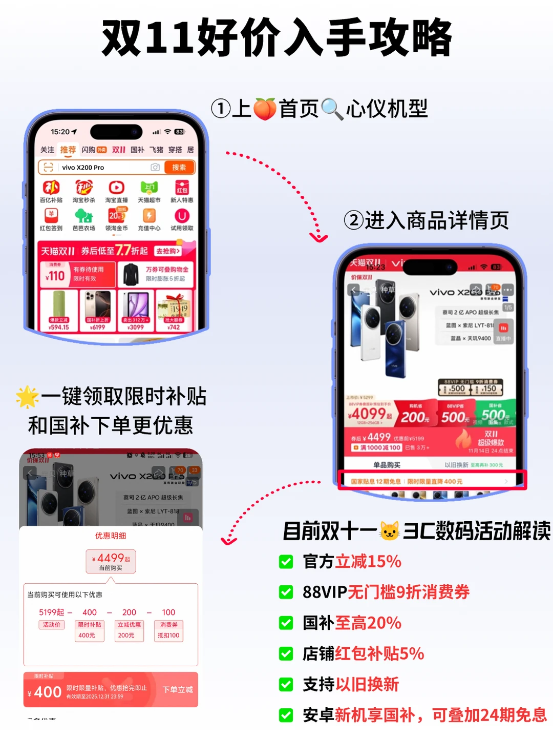 纠结 vivo X200 Pro 和 X300 Pro?这篇精简版对比直接帮你快速定! ●性能: X200 Pro(天玑 9400+ V3 +芯片):日常刷剧、游戏,流畅度完全够用 X300 Pro(天玑 9500 + V1S+V3 + 芯片):重度游戏、多任务切换,性能输出更稳更持久 ●影像: X200 Pro:5000 万主摄 + 2 亿长焦,日常拍照、拍风景够用 X300 Pro:传感器全面升级,另外支持蔡司增距镜 + 全焦段闪光灯,变焦和暗光拍摄更专业 ●核心体验: X200 Pro:6000mAh + 微曲屏,手感温润,续航够日常用 X300 Pro:6510mAh + 直屏更轻薄,无线充电更快,重度用续航更顶 💟总结: 👉预算卡在 4K 内、想要均衡体验的宝子,冲 X200 Pro 性价比很香 👉爱拍照 / 玩游戏、想要 “顶配体验”,直接选 X300 Pro 不踩雷 🐱好价入手攻略(p3) 另外像vivo X300Pro这种新机还能享受国补➕24期免西