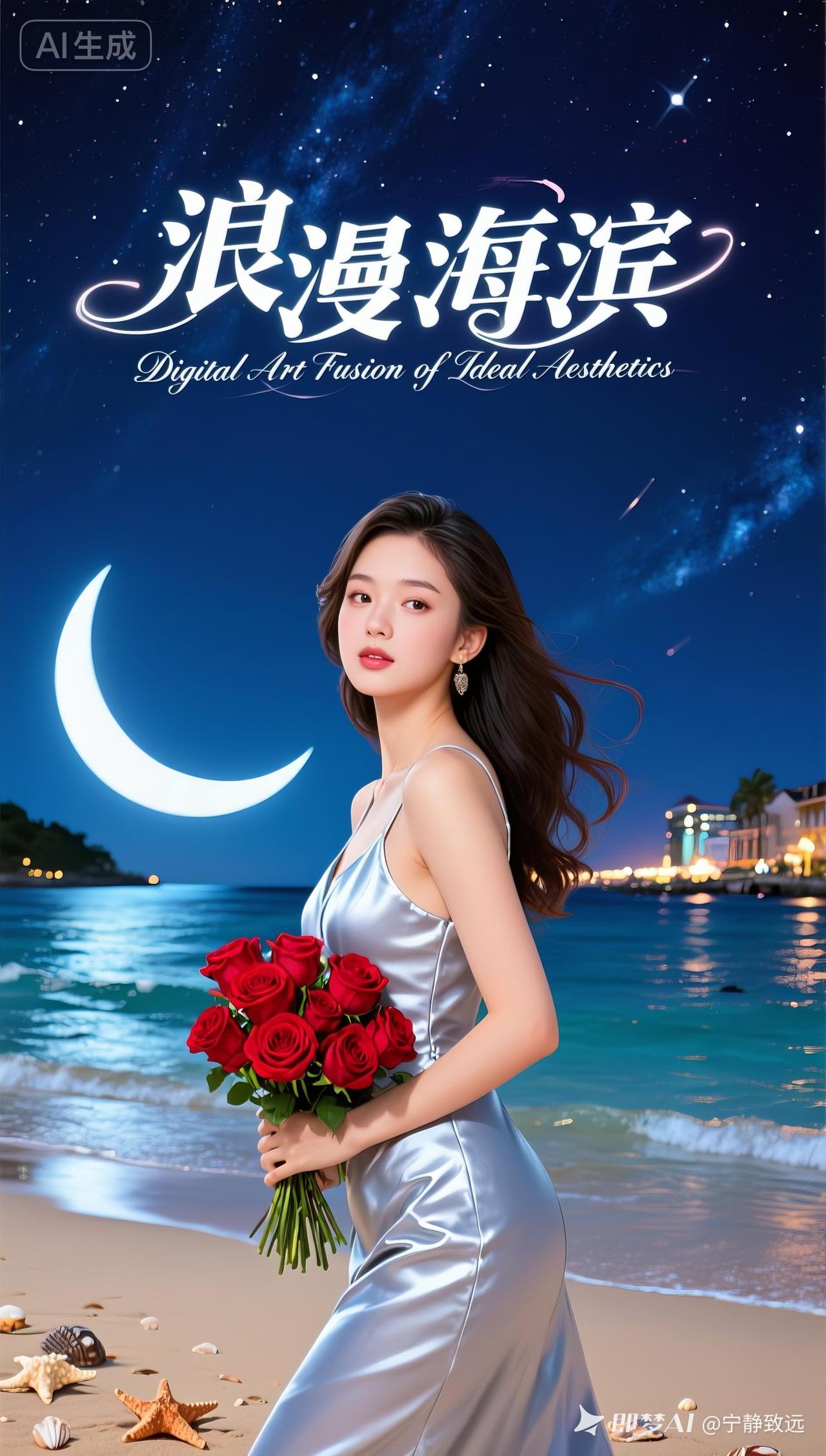 弯月夜空悬于天际,海滨沙滩映着远山城镇灯火,银白晚礼服佳人漫步滩涂。红玫瑰绽于海风间,理想美学与自然景致交融,氛围感拉满。