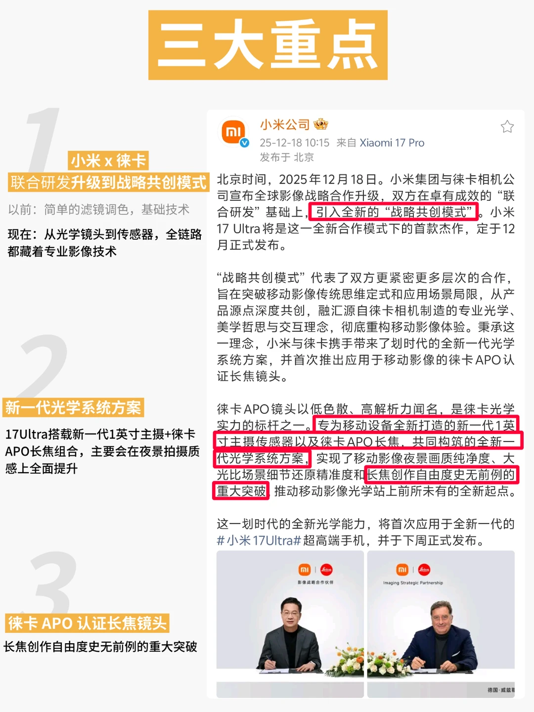 ✨️深入一看小米 17 Ultra 的最新爆料后,这波合作确实不简单。这次双方的关系已经升级到是 “战略共创” 的深度绑定了,从光学镜头到传感器,全链路都藏着专业影像技术,确实可以称得上是移动影像光学新起点。