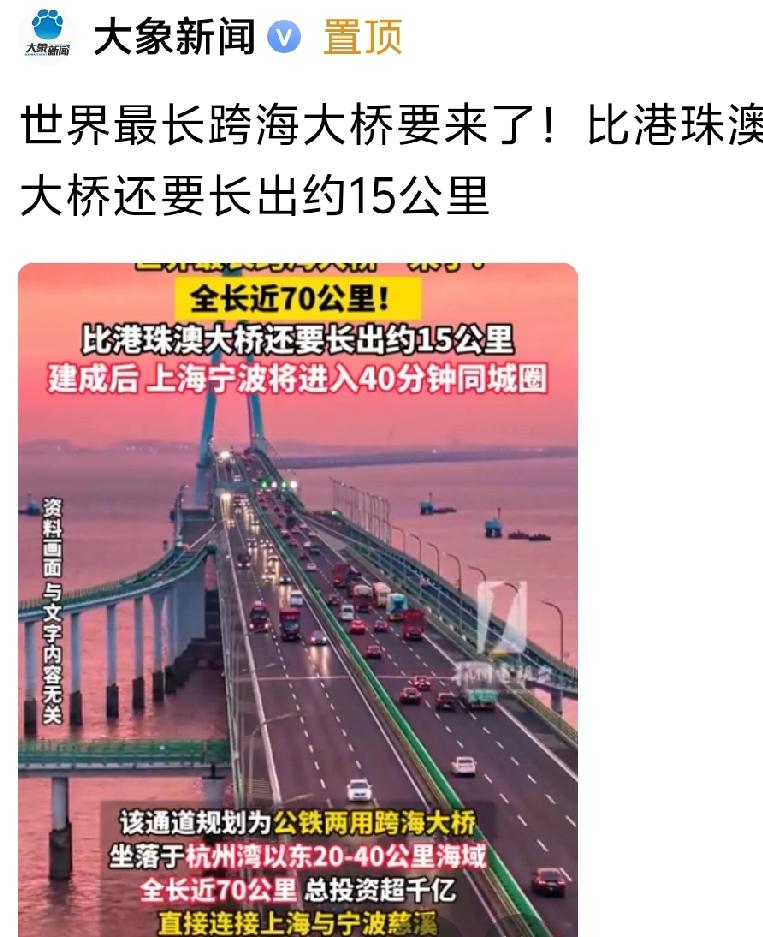 世界上最长的桥要来了,比港珠澳大桥还要长出约15公里 2026年3月,沪甬新跨海大桥项目正式敲定,它是世界上最长的桥,比港珠溪大桥还长出约15公里,让许多观察者都瞪大了眼。 这座桥并不只是连接宁波和上海的又一条通道,其实和原来的跨海大桥还有已经在建的高铁大桥相比,只不过向东稍微挪了十来公里,跑下来快十分钟罢了。 但宁波却相当坚持:桥墩必须落在上海金山。表面看,这似乎只是路径选择、交通效率的小优化,实则背后藏着宁波人的深层城市野心。 宁波一直在寻求“接轨上海”,讲究“沪甬同城化”,而不满足于做长三角南翼的末端。以前连接嘉兴,这是标准的“宁波-嘉兴-上海”路线,宁波永远隔着一道行政边界,心理上像邻居的邻居。 如今直接把桥头搭进金山,行政地图上宁波和上海紧挨着,从地理到心态都拦不住拉近的决心。这点,非常符合宁波一贯的“向北看”战略:要做“上海一家人”,不做“嘉兴转手”。 这种思路,不只是地理上的接触,更是战略上的区域重塑。以往,无论是高速还是高铁,宁波要借道苏州、嘉兴等地才能融入国家干线,像个被动的过客。 现在直连金山,打造专属通道,不再依赖任何第三方节点。这样一来,宁波在长三角的话语权提高了一个档次,和北翼的南通、苏州争夺发展重心,防止自己被边缘化。桥墩落地金山,是在城市竞争盘面中做了一场大胆的“地理跳跃”。 同城化不仅看交通时间,更看资源流通。如果只是省十几分钟,那千亿投资就太冤了。实际上,“同城”意味着高端资源可以直达——金融、科研、航运这些上海的核心资源就能顺畅渗透进宁波。 宁波向来制造业强,但渴望快速和上海的金融与创新对接。桥基直接连进上海,就是开了一个高速口岸,让宁波成为上海功能溢出的第一受益者。资源无截留、无损耗,一线传导,这才是宁波真正要的东西。 所以,这座桥的意义远不止是便利通勤。它代表着宁波通过物理手段实现心理上的晋级——不再满足做一个重要节点,而是努力挤进上海城市圈的核心配套位置。 这背后的执念,其实是宁波希望更快、更直接地吸取上海的金融资本、创新技术和高端产业。这些资源关系到城市能级提升,决定未来几十年宁波的发展筹码。 最终,这场“大桥执念”透露出宁波对自身定位的焦虑,也体现其想突破边界、卷入更高层次资源流动的野心。桥墩落在金山,是一次城市格局的主动突围,宁波人用行动诠释了“靠得近还要粘得上”的战略愿景。