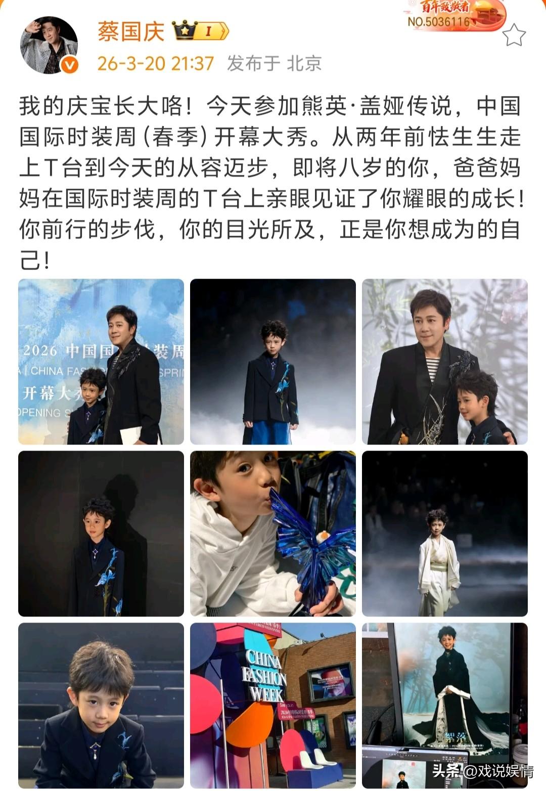 蔡国庆夫妇陪小儿子走秀! 3月20日,蔡国庆晒出小儿子庆宝走秀的照片,且意外透露了小儿子的大名:蔡承勋。 庆宝留着蓬松的黑色卷发,眼神沉静地直视镜头,气质清冷,自带超模气场。走在T台上步履从容,面带自信的笑容。 庆宝的表现令蔡国庆感到骄傲,他称赞即将8岁的庆宝两年来有了质变般的成长:从两年前怯生生走上T台到今天的从容迈步,爸爸妈妈在国际时装周的T台上亲眼见证了庆宝耀眼的成长! 原来庆宝的每一场走秀,都是蔡国庆夫妇在陪伴着! 另外感觉蔡国庆好会给两个儿子起名字:大儿子蔡轩正,小名庆庆;小儿子蔡承勋,小名庆宝。大名都好听,小名都离不开一个“庆”字。这大概寄托了爸爸对两个儿子深深的爱吧!
