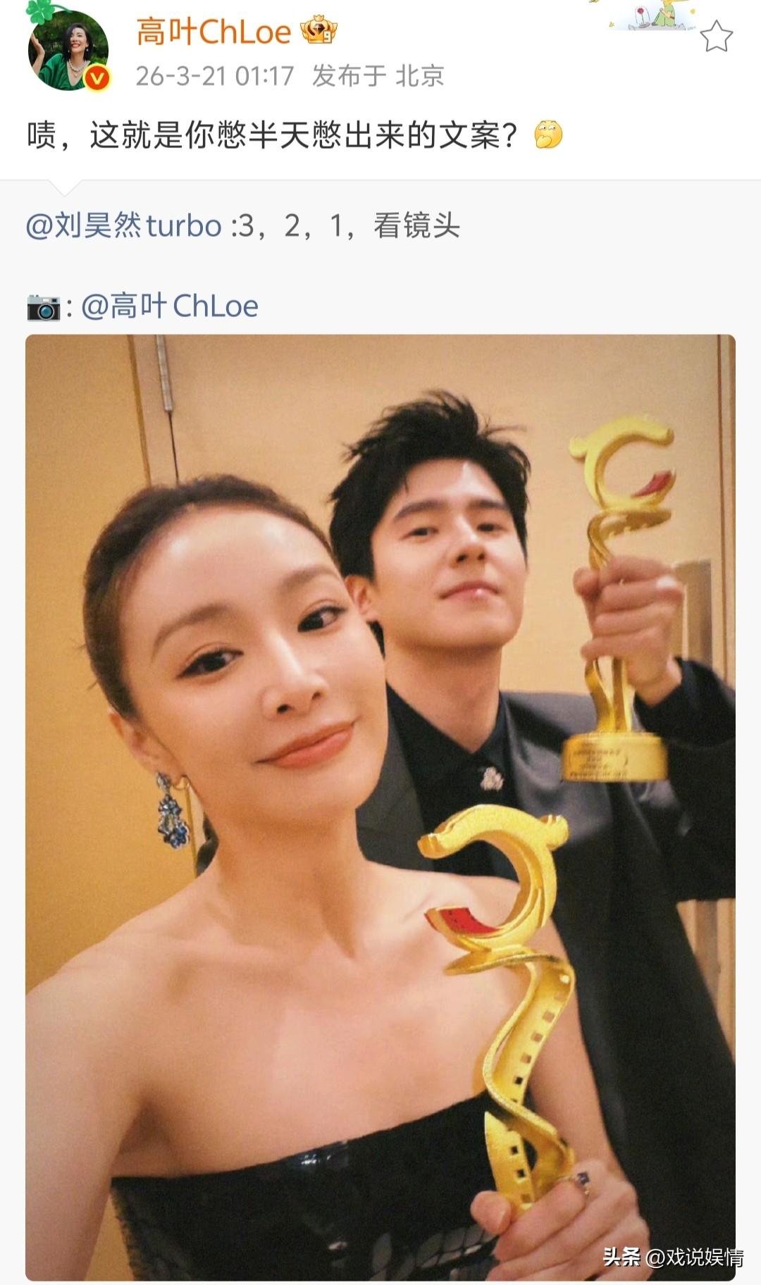 刘昊然获奖后晒与高叶合影,不料文案被高叶无情吐槽! 3月20日,刘昊然与高叶领衔主演的历史题材电影《南京照相馆》在首届CMG中国电影盛典横扫5项大奖,包括"年度剧情电影",刘昊然与高叶分获"年度剧情电影男/女演员"。 次日凌晨,刘昊然晒出两人在台下手捧奖杯的合影,配文“3,2,1,看镜头”。随后,高叶转发并无情吐槽刘昊然:“啧,这就是你憋半天憋出来的文案?” 显然刘昊然是太谨慎了,既沉稳又内敛,生怕写出的文案词不达意或被公众批判。而高叶则多了几分内娱明星近几年少有的“活人感”,太可爱了!