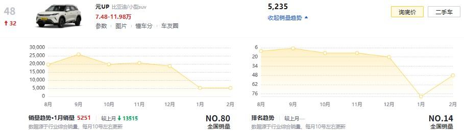 接着说销量的那些事儿。 11月上市的启源Q05,都说是元UP的直接对手。上个月,这两款的销量如何呢? 元UP 5235辆,启源Q05是3852辆;元UP依然领先,但这两款的差距缩小到2000以内了。因为2月份有一个春节,数据失真。那就看3月份的情况。 这两款价位接近,元UP的优势是有BYD背书,Q05优势在料足,性价比高,如尺寸,续航等。