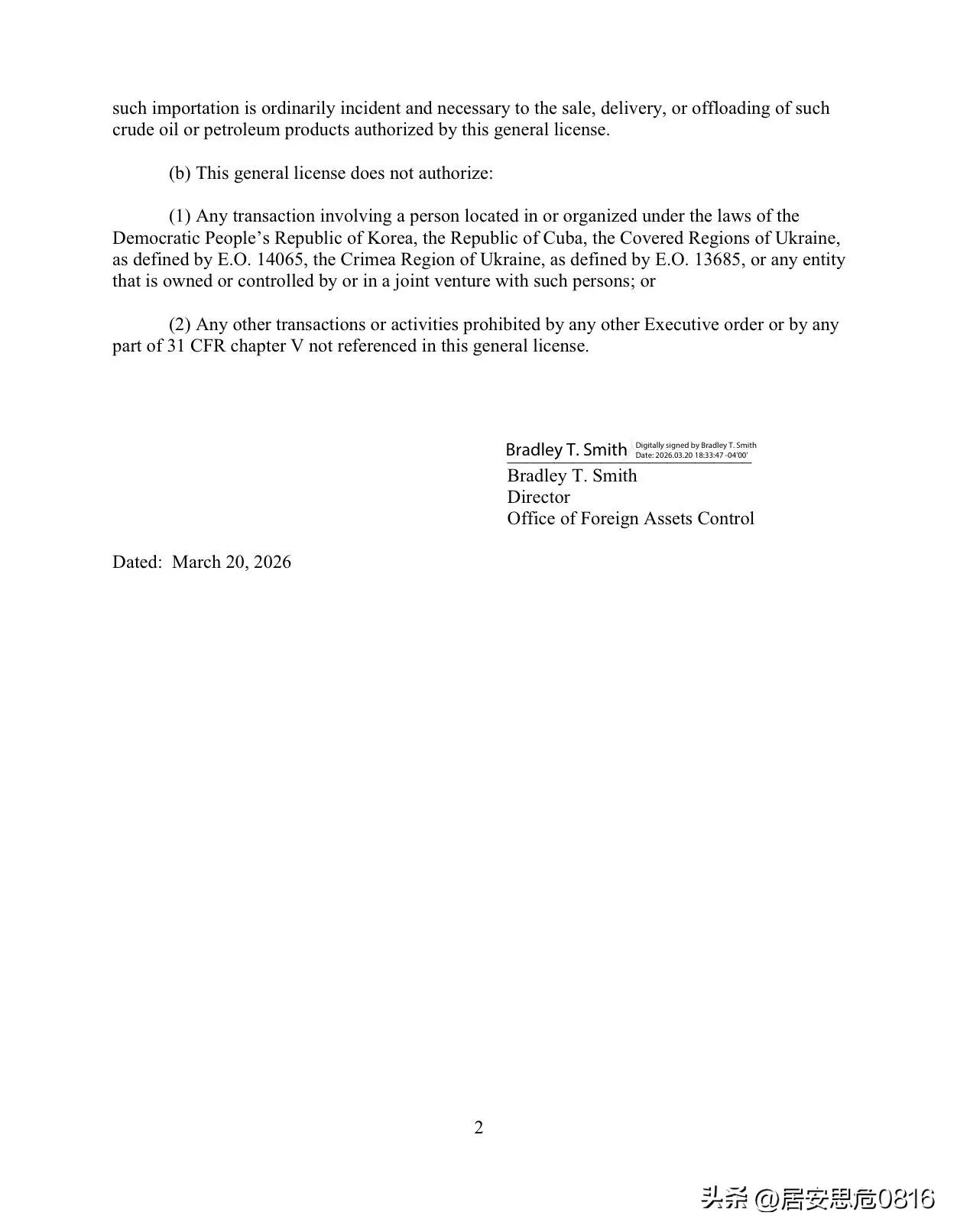 美国财政部外国资产控制办公室发布了豁免令,暂时解除对源自伊朗伊斯兰共和国或从伊朗运载石油的油轮实施的几乎所有制裁,该豁免令名为“授权交付和销售截至2026年3月20日装载在船舶上的伊朗原油和石油产品”,适用于2026年3月20日凌晨12:01(美国东部时间)或之前装载的船舶,有效期至2026年4月19日凌晨12:01(美国东部时间)。