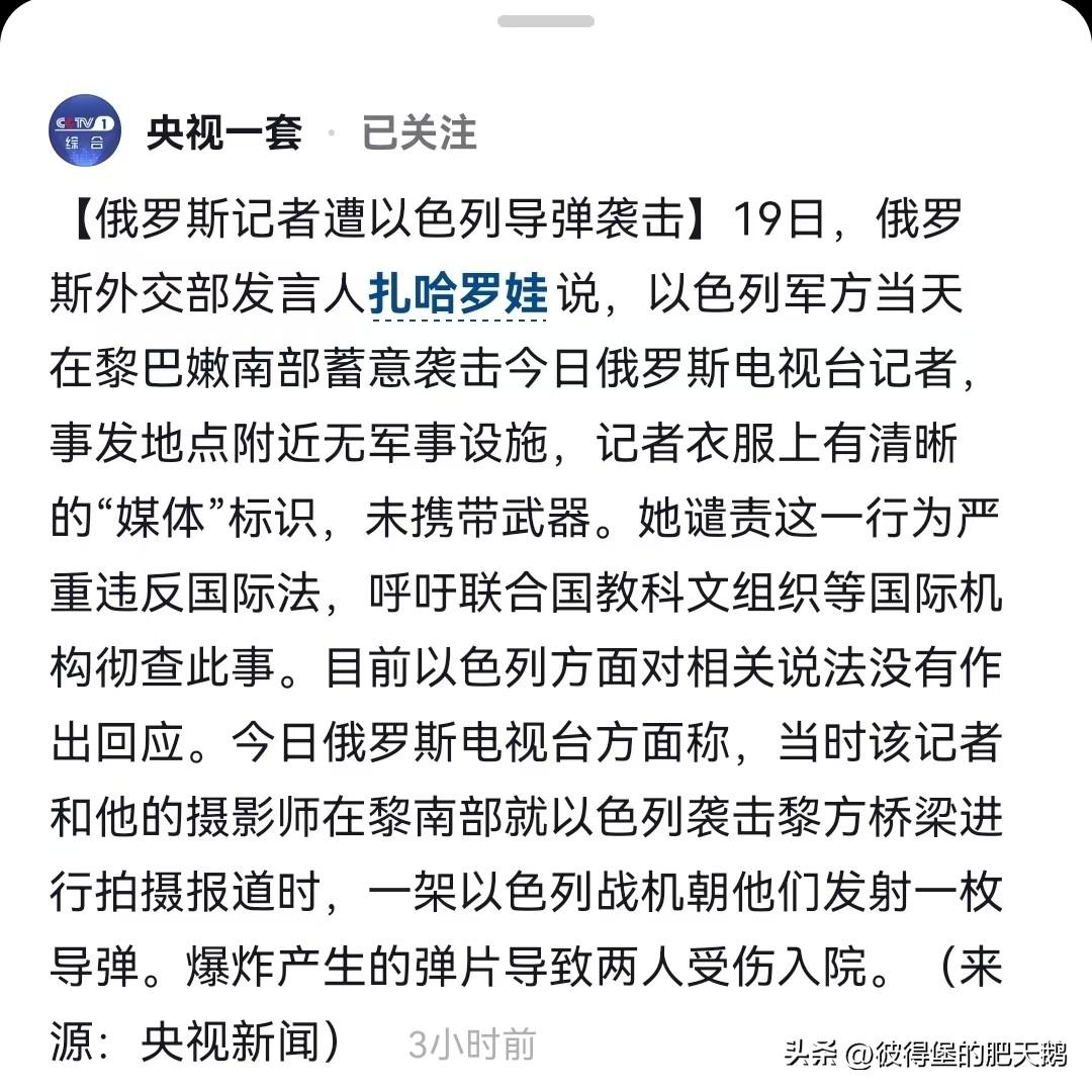 以色列匪兵杀害记者是日常操作啊,打加沙的时候,被它们杀害的记者照片都能贴满一面墙了。 3月19日,俄罗斯外交部发言人玛利亚·扎哈罗娃说,以色列军方当天在黎巴嫩南部蓄意袭击今日俄罗斯电视台记者,事发地点附近无军事设施,记者衣服上有清晰的"媒体"标识,未携带武器。她谴责这一行为严重违反国际法,呼吁联合国教科文组织等国际机构彻查此事。目前以色列方面对相关说法没有作出回应。今日俄罗斯电视台方面称,当时该名记者和他的摄影师在黎南部就以色列袭击黎方桥梁进行拍摄报道时,一架以色列战机朝他们发射一枚导弹。爆炸产生的弹片导致两人受伤入院。(来源:央视新闻)